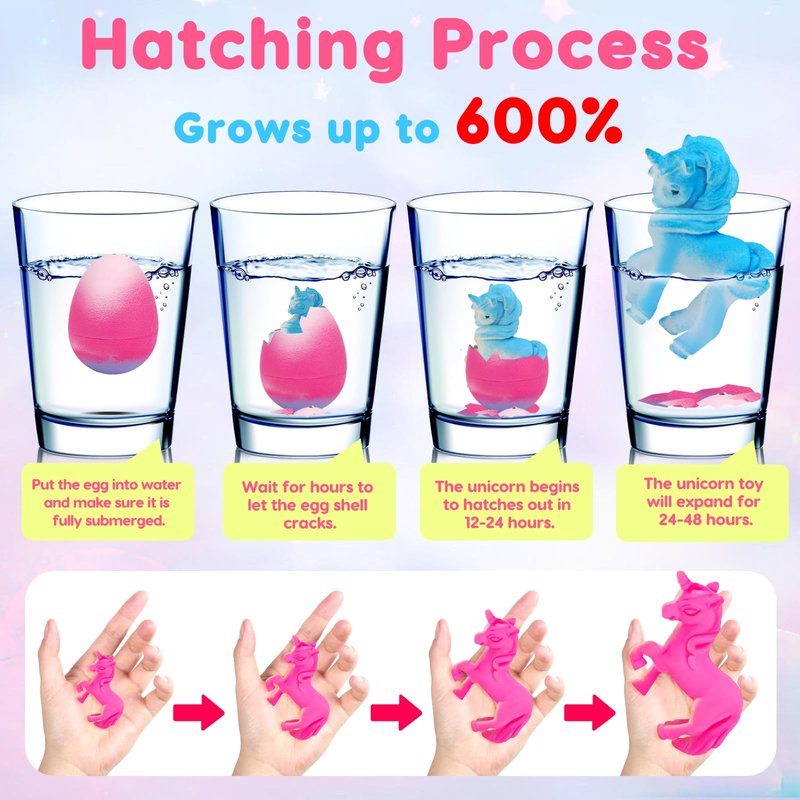 - 【Perfect Water Growing Toys】To begin hatching the surprise eggs, the 3.2 inches egg should be submerged underwater and filled with water from the supplied holes. Once the toy egg soaks up enough water, the shell cracks in 12-24 hours, then a unicorn hatches out and expanding for 24-48 hours. The unicorn toys for girls shrink eventually and you can re-expand them in water again.