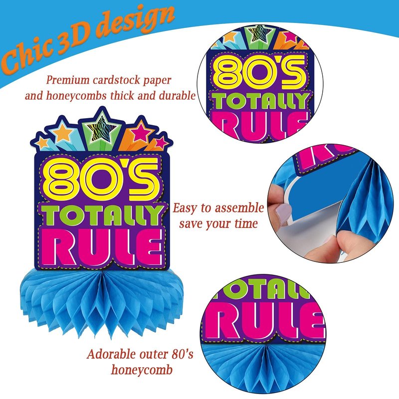 - Great 80's party supplies: these 80's retro table centerpieces exquisitely designed with interesting elements so that everyone will love these chic designs. Decorating your home and party with our honeycomb centerpieces will be a big hit at your party.