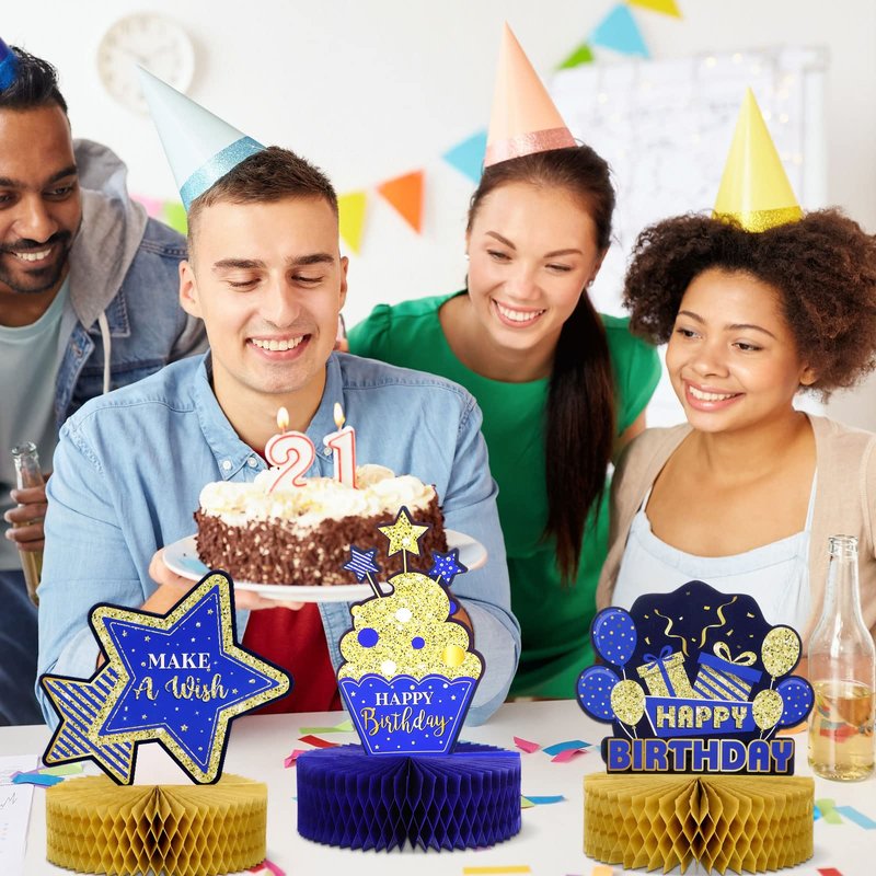 9 Pieces Blue Gold Birthday Table Decorations Happy Birthday Honeycomb Centerpieces Glitter Table Toppers, Blue and Gold Party Decorations for Kids Baby Shower, Men and Woman Birthday Supplies