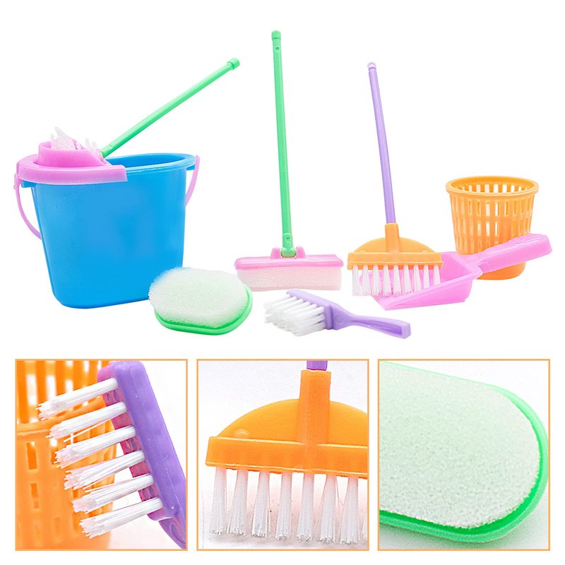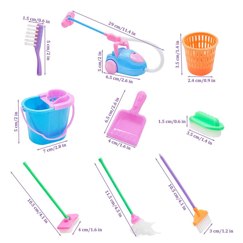 - 【Barbie Doll House Accessories Set】Include 9 Pieces Cleaning Tools: Mop Bucket, Broom, Hand Sweep, Mop, Vacuum Cleaner, Shovel, Rubbish Can, Glass Brush, Brush