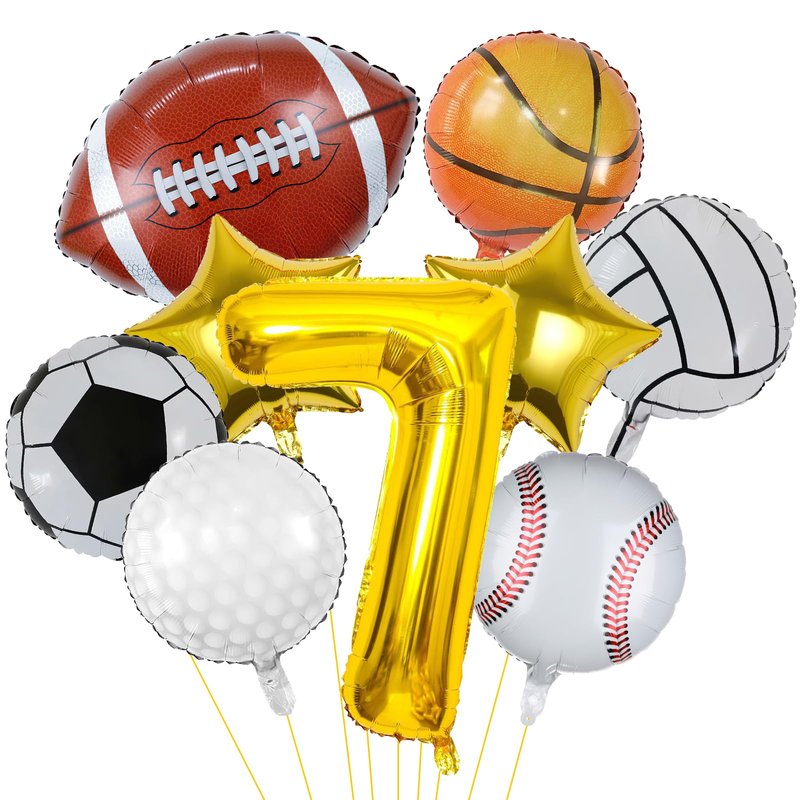 - Package Included: 1PC Football, basketball, baseball, volleyball, golf and soccer foil balloons, 2pcs18’’ gold star balloons, 1pc 40 inch gold number balloon. Totally 9PCS. Perfect for a sport theme party.