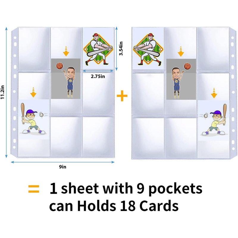- 【DOUBLE-SIDED DISPLAY】: 9 pockets per page trading card sleeve for double-sided display, 9 pocket trading card pages can hold 18 cards, 50 page, Holds 900 Cards. Dimensions: 3.54*2.75 inches, each pocket can hold up to 2 1/2 x 3 1/2 cards.You use a picture showing cards being inserted into both sides.