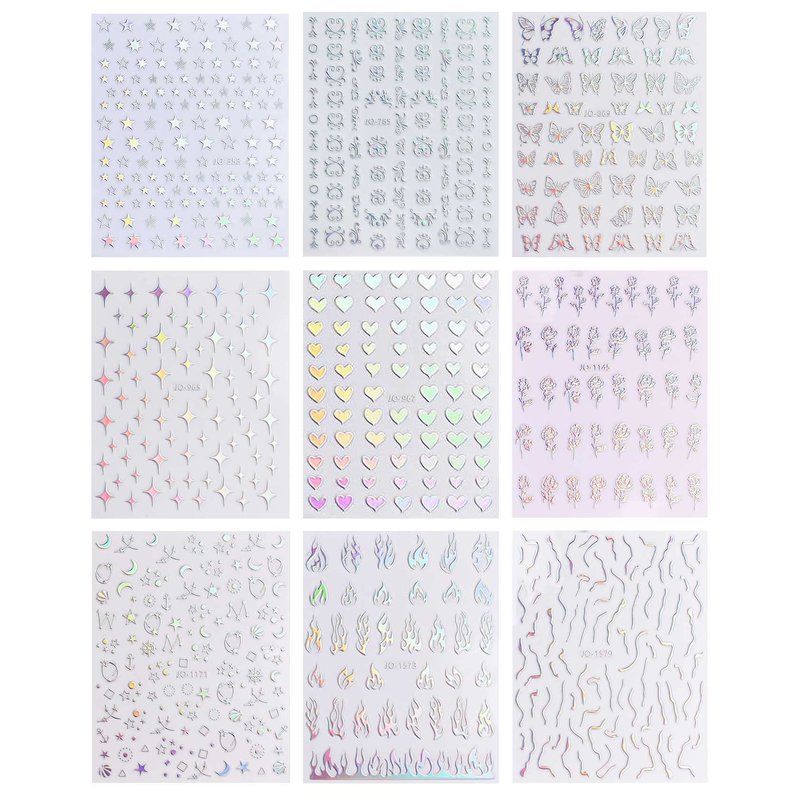 9 Sheets Holographic Nail Art Stickers Decals Self-Adhesive Pegatinas Uñas Heart Flame Stars Butterfly Moon Nail Supplies Nail Art Design Decoration Accessories