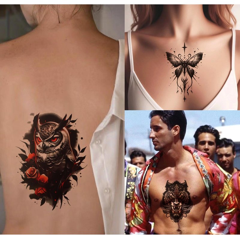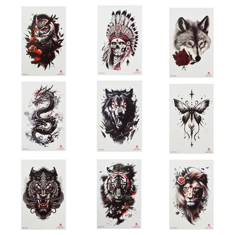 - 9 STYLES: The temporary tattoos are designed with 9 different patterns, such as lion, tiger, cat, owl, parrot, etc.; which can be applied to arms, hands, legs, feet, collarbone, neck, chest, back and even smooth surfaces like plates, glasses as you like.
