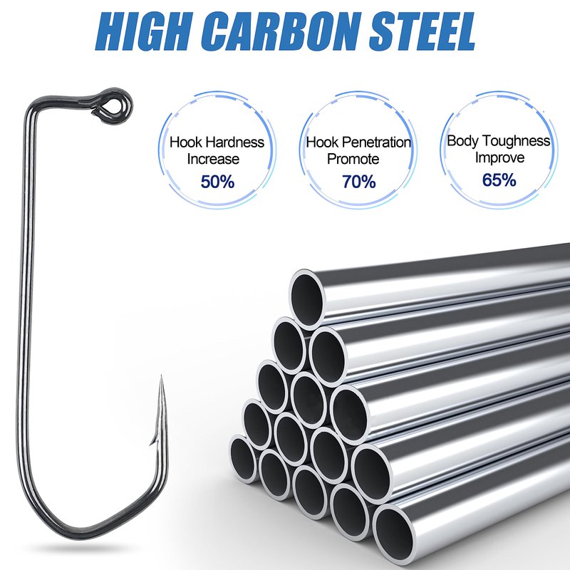- High carbon steel hook wide bend allows for more aggressive hook set; definitely increase the chance of landing the catch