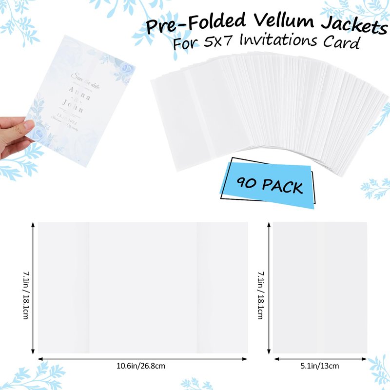 - SIZE: Vellum jackets for 5x7 invitations are 5.08 inches wide and 7.08 inches long when folded, so make sure your invitations are 5 x 7 inches. A total of 90 sheets of vellum paper 5x7 for invitations is specifically designed for 5" x 7" photos, greeting cards, and wedding invitation, making the envelopes more beautiful and attractive.