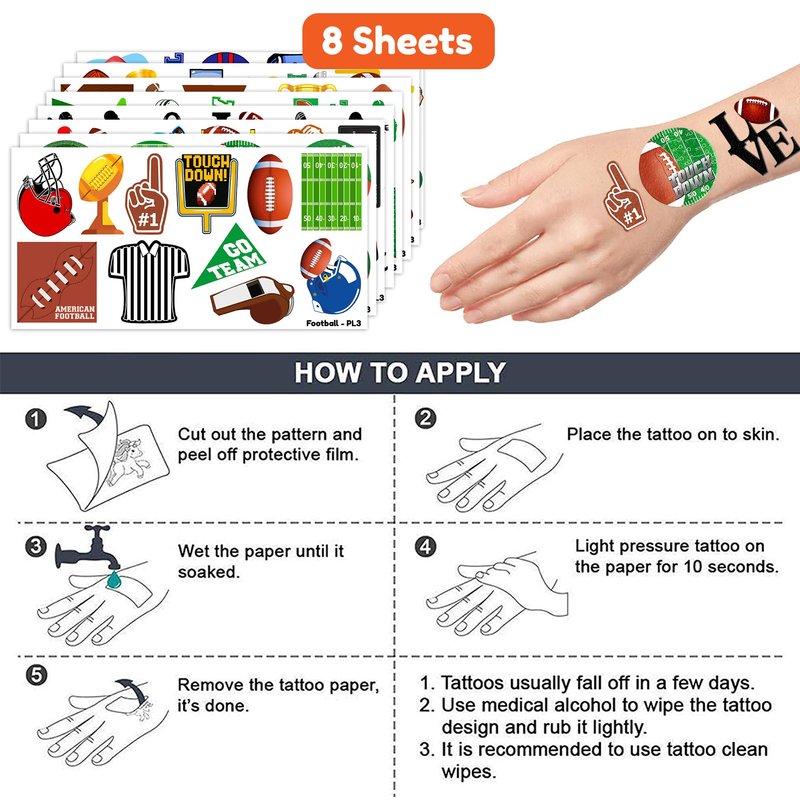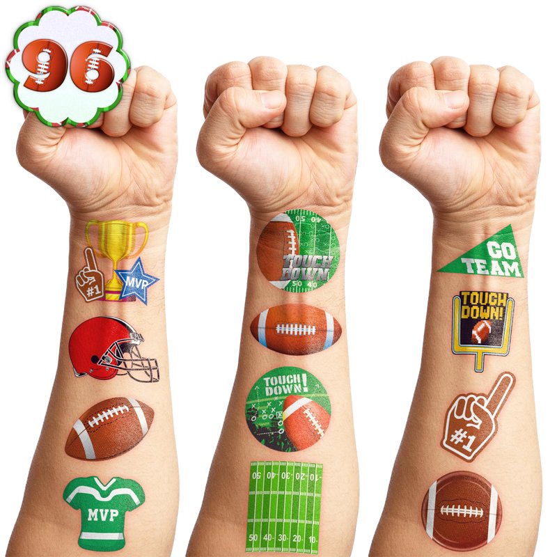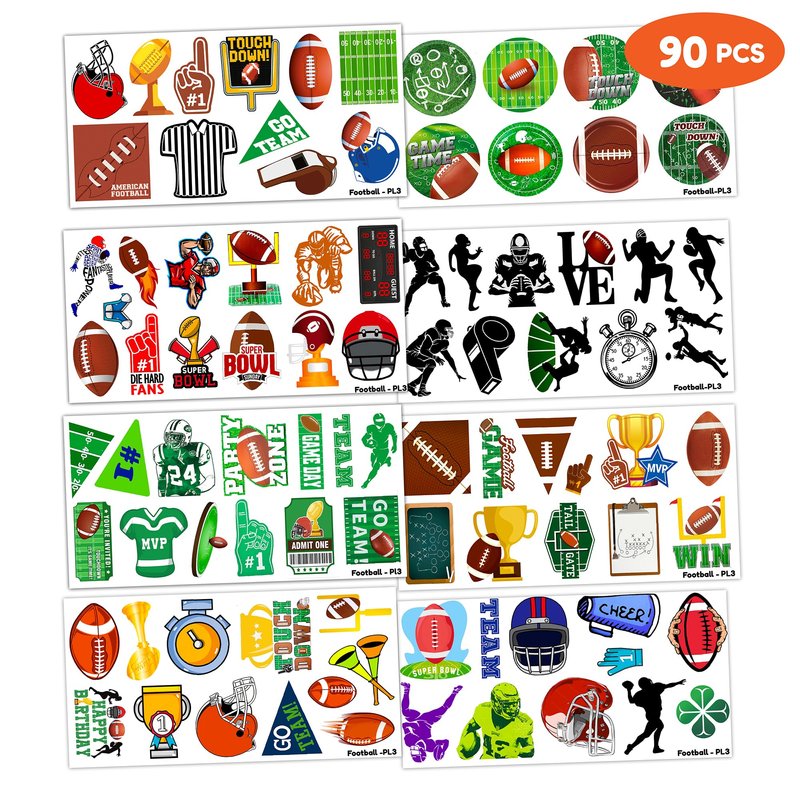 - The Perfect Cute And Funny Brown First Year Down American Football Theme Party Gift: 8 Sheets Soccer Sport Rugby Fans Cheerleaders tattoos stickers, each sheet measures 6.1 * 3.1 inch , one size fit all adult and kids. One of the most popular party themes for children, make the best party gifts for your children & Carnival gifts, help your children become small heroes at the party! Bring nonstop joy to the whole party! Make your kids receive full of expectation and exploration in every festival.