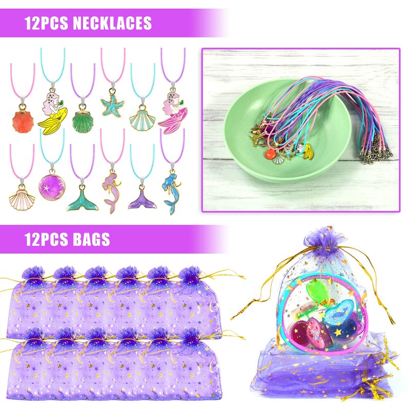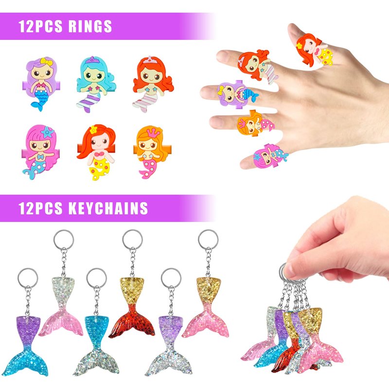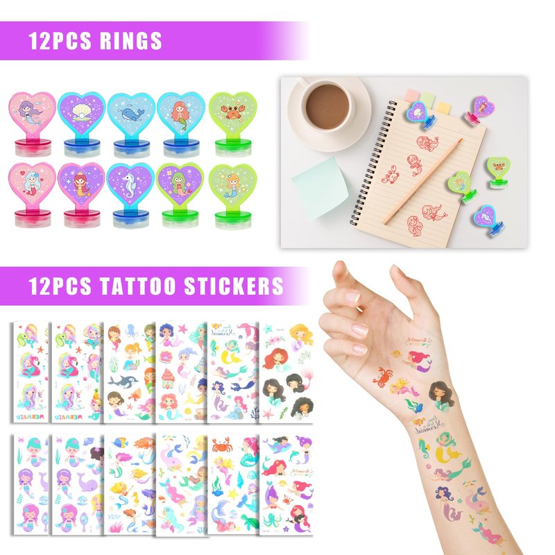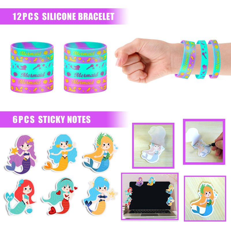 - Quantity: You will receive 12 mermaid stamps; 12 mermaid tail keychains; 12 mermaid rings; 12 mermaid theme necklaces; 12 mermaid silicone bracelet; 6 mermaid post-it notes; 12 mermaid tattoo stickers, 12 mermaid purple gift bags. Children and adults will love these cute mermaid party favor supplies!