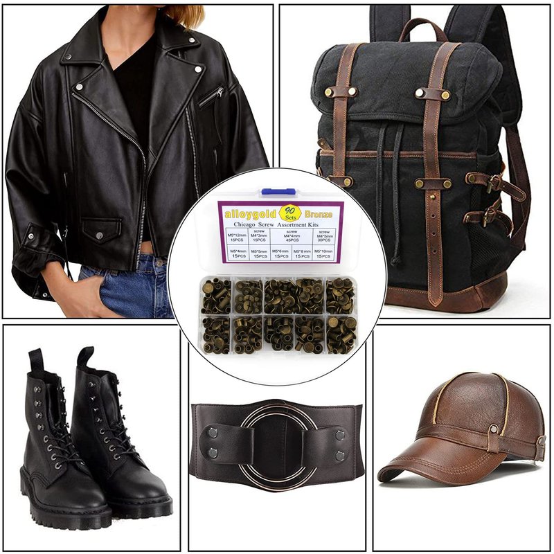 Are you on the hunt for a complete and versatile leather rivet kit? Look no further than our 90 Sets Bronze Chicago Screws Leather Assorted Kit. This kit includes six different sizes of screw rivets for leather, featuring M5*4mm, M5*5mm, M5*6mm, M5*8mm, M5*10mm, and M5*12mm, with 15 sets of each size. Moreover, with three different lengths of screws (M4*3mm, M4*4mm, M4*5mm), you can easily combine and customize them according to your needs. Whether you are creating belts, handbags, leather shoes, binding documents, books, photo albums, DIY crafts, or other leather items, our rivets are the perfect addition to your tool kit. They are strong, durable, and have an excellent finish with good screw head chamfering. Additionally, they feature a low profile slot and professional appearance that adds to their ease of disassembly and installation.Our Chicago screws are made with high-quality carbon steel and advanced nickel plating, which gives them a stable and dense oxide film on the surface, ensuring they don't come loose and are resistant to rust. With this kit, you can let your imagination run wild and create a variety of beautiful and practical leather crafts.Plus, we've included a reusable storage box that keeps all of the Chicago screws organized and easy to find. The screws are arranged according to size, helping you to locate the ones you need quickly and efficiently. Order our 90 Sets Bronze Chicago Screws Leather Assorted Kit today and add a professional touch to all of your leather crafts!