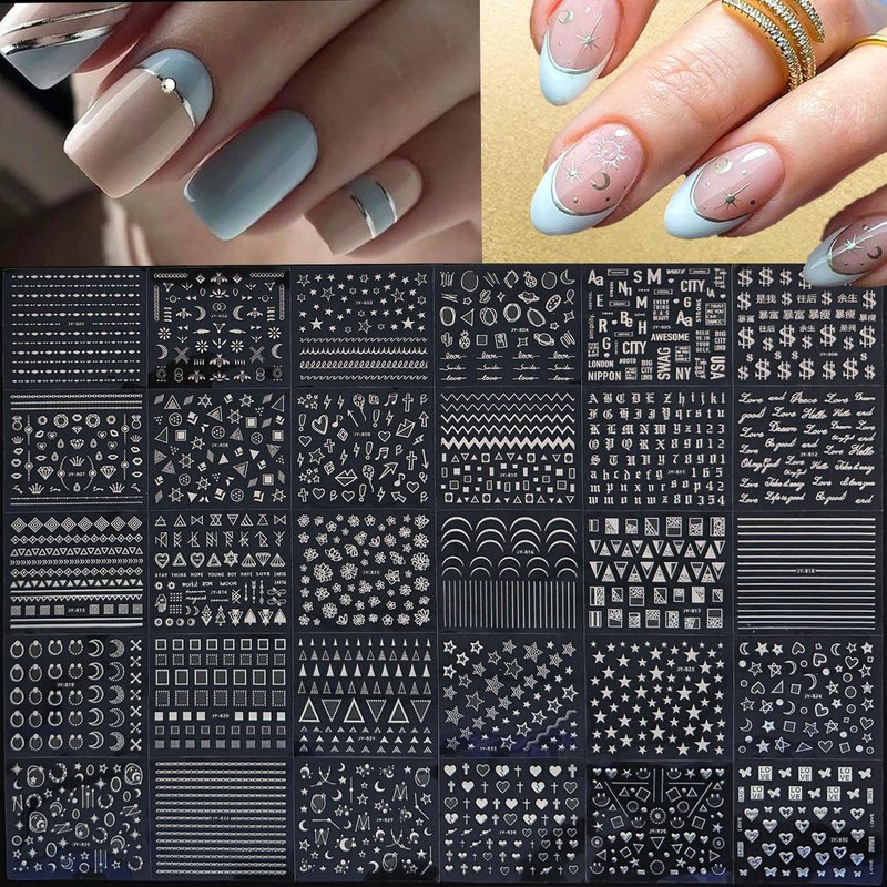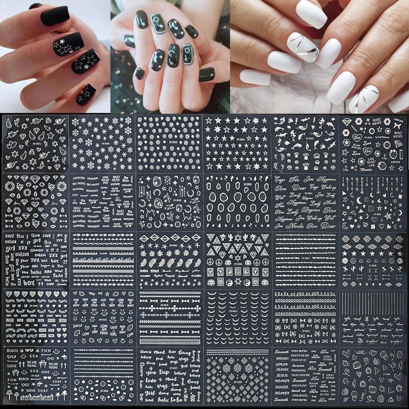 90 Sheets Silver Nail Stickers Star Line Moon Leaf Butterfly Flower Nail Art Decals for Women Manicure Decorations Set