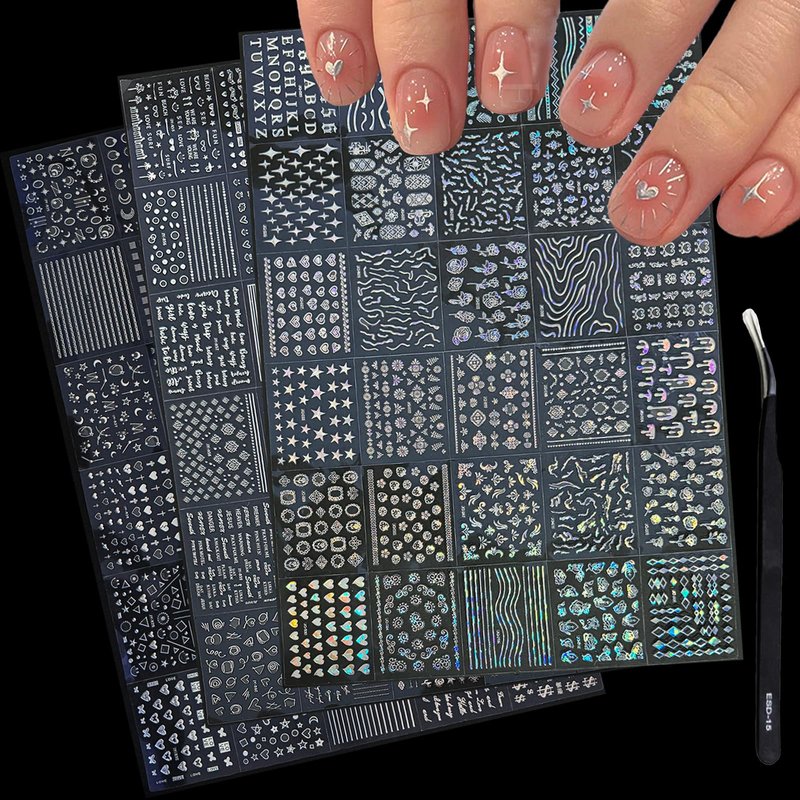 Quantity: 90 sheets silver nail decals + Nail Tweezer