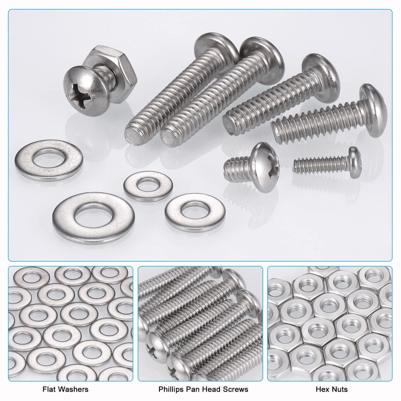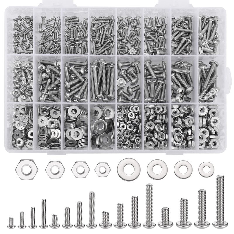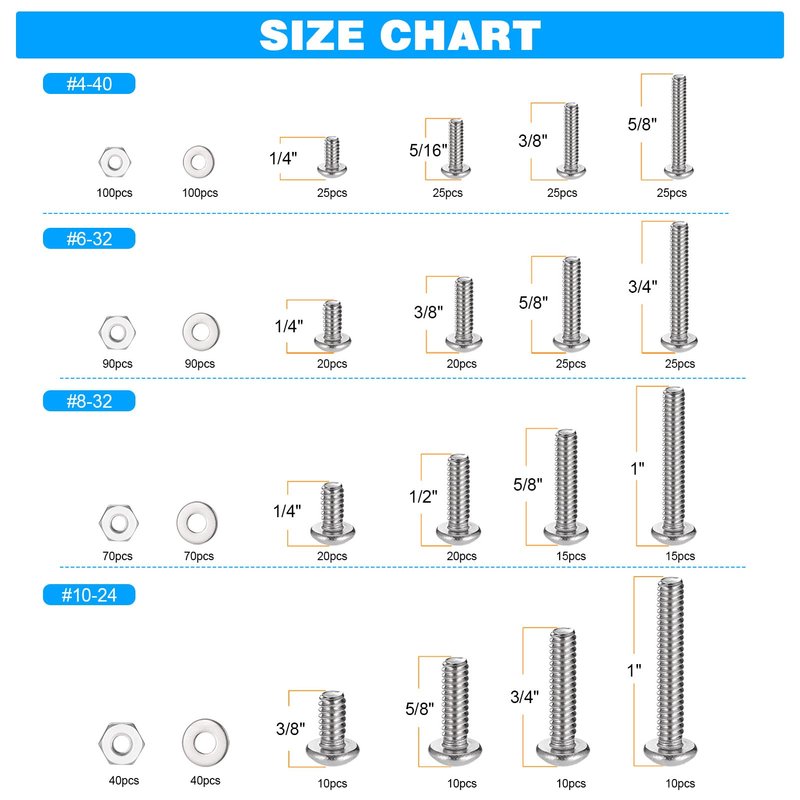 - Super Handy Assortment: This set includes various #4-40, 6-32, 8-32, 10-24 screws with nuts and flat washers that a regular household needs. Compared to the time it takes to go to a hardware store and the cost of buying single fastening, this is a time and money saver