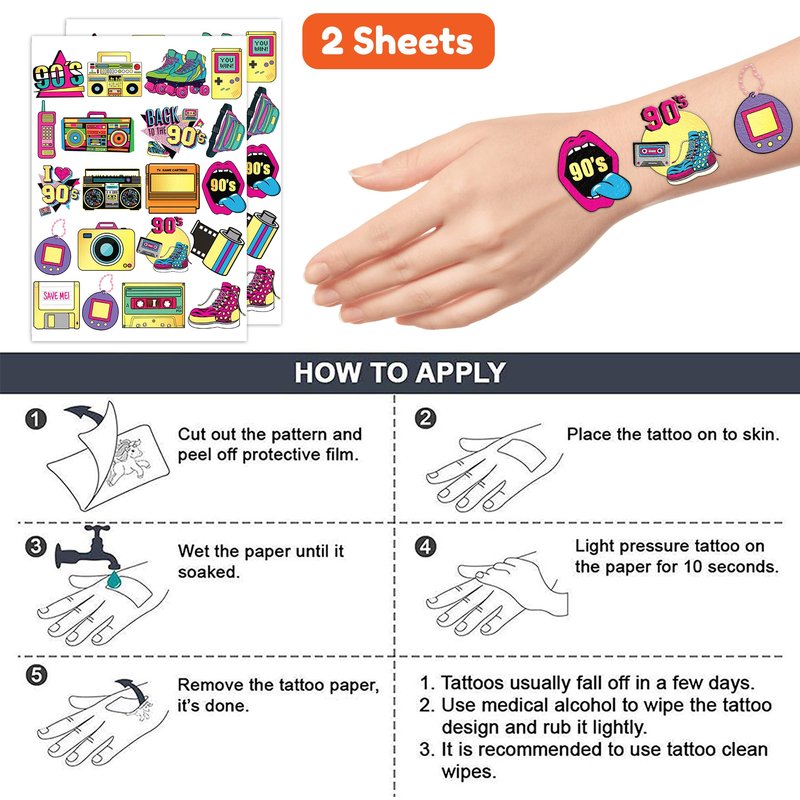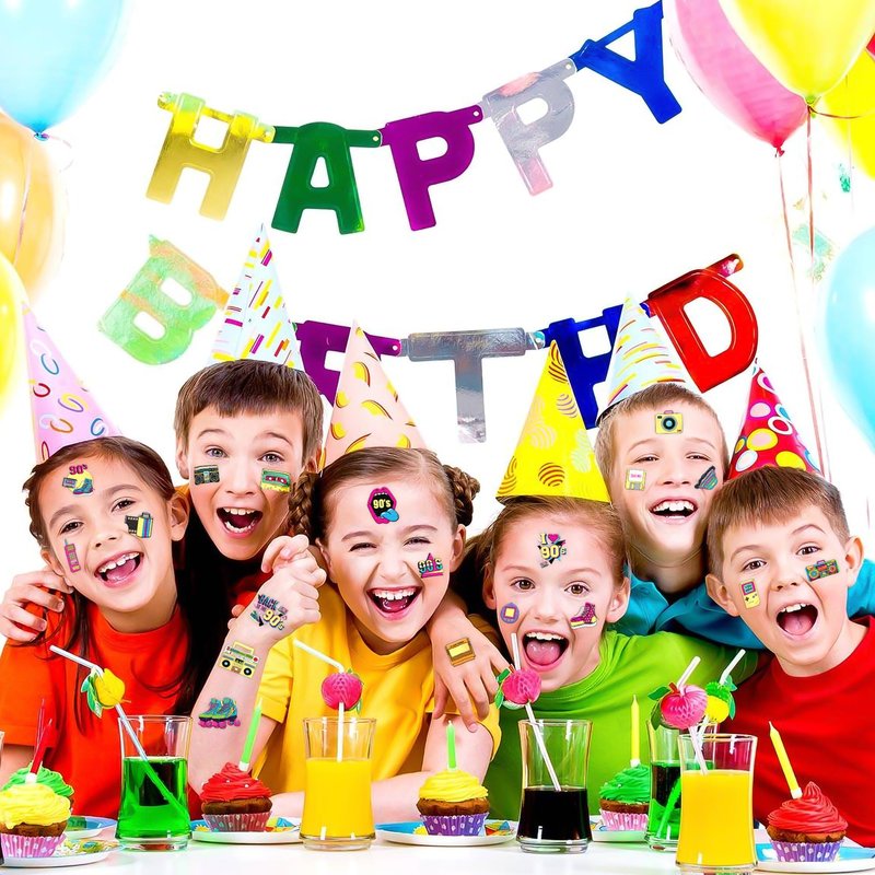 - The Perfect 90s 80s Theme Birthday Party Supplies Gifts: 2 Sheets 90s 80s Glitter retro tattoos stickers, each sheet measures 6 * 8.25 inch , one size fit all adult and kids. One of the most popular party themes for children, make the best party gifts for your children & Carnival gifts, help your children become small heroes at the party!