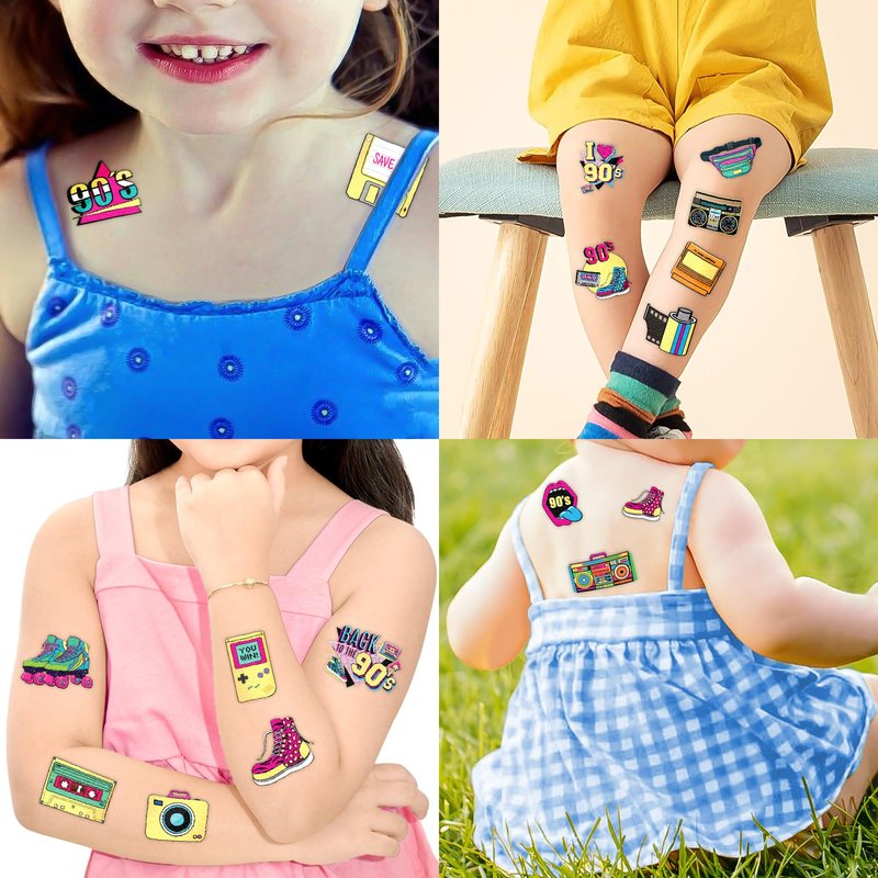 - Cute patterns: 90s 80s Glitter Temporary tattoo stickers, features an assortment, colors are bright, and designs are adorable, which are attractive to children. Our party favors are based on children's happiness both in appearance and inwardness.