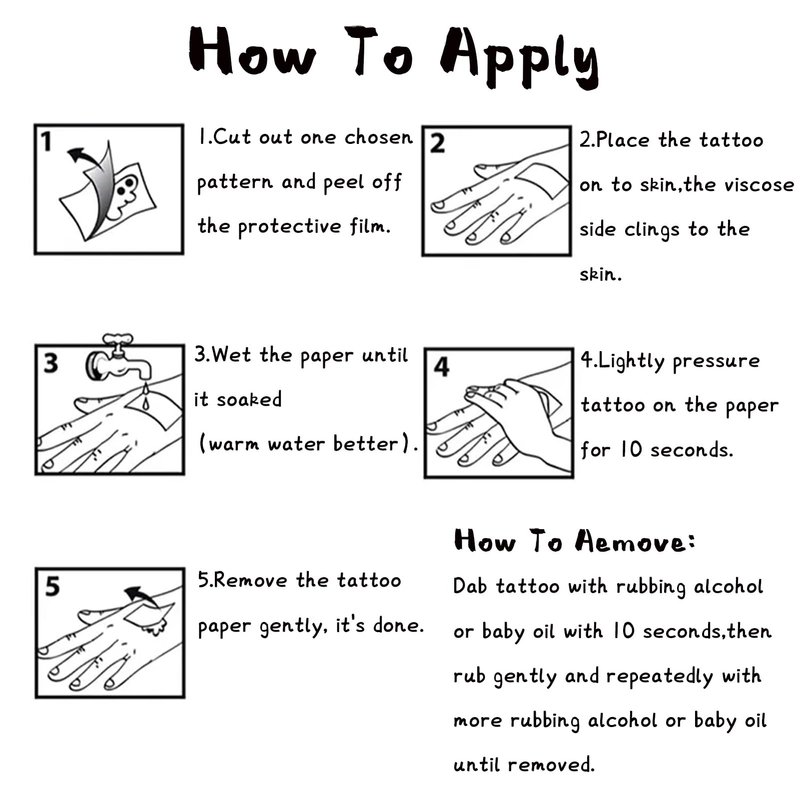 - Easy to Use and Remove: Cut the tattoo you like with scissor, and then face down on skin, wet the tattoo with water and wait for 10 seconds. Then gently tear off the white surface. You will get a luminous tattoo! TIPS: Luminous tattoos need to be activated under light for a few minutes, which can make them more luminous in the dark.