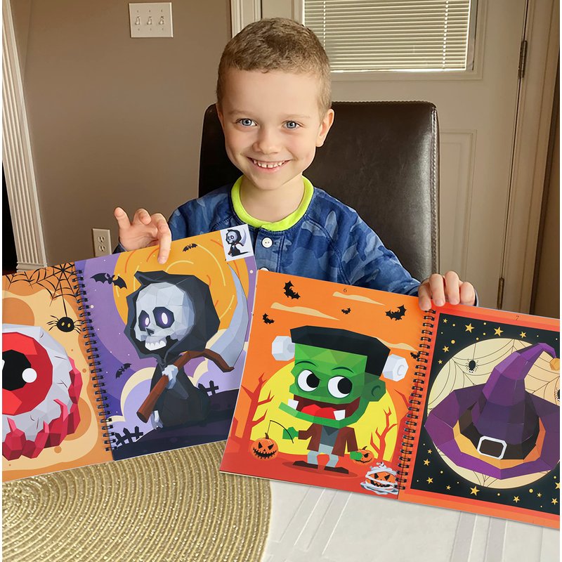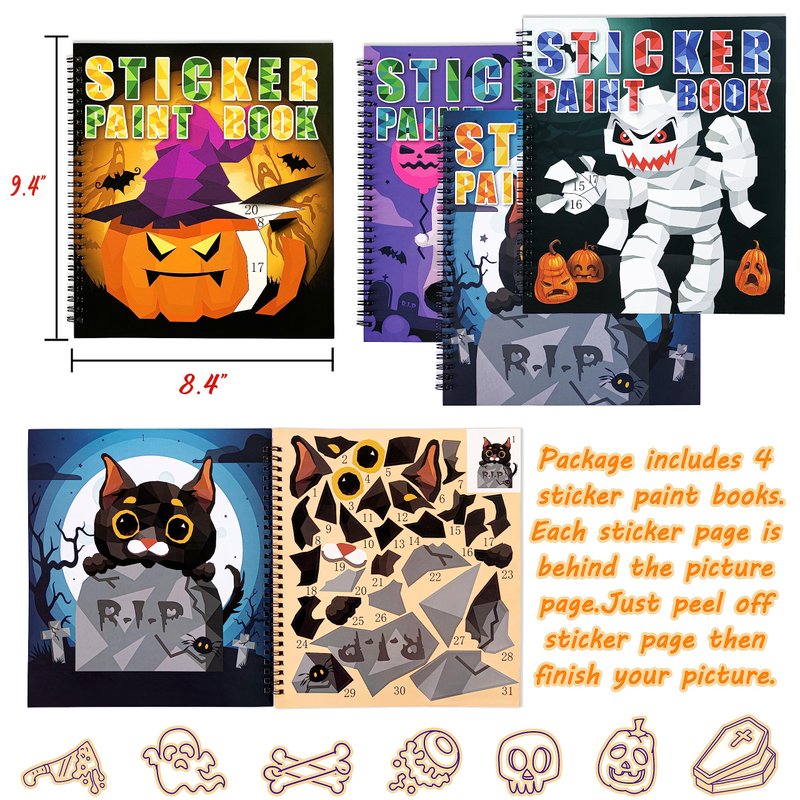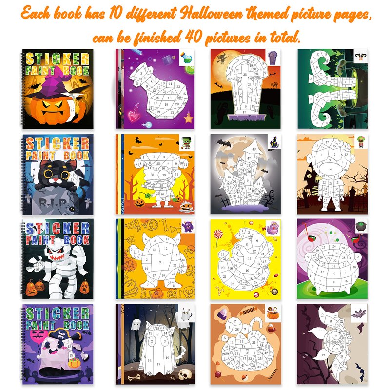 - Books are perforated page designs - Package includes 4 Halloween themed sticker books and 40 sheets of stickers.Each book has 10 different Halloween element picture pages,can be finished 40 pictures in total.All the pages are perforated.It’s easy to tear off your finished work to share with your friends or frame it up.