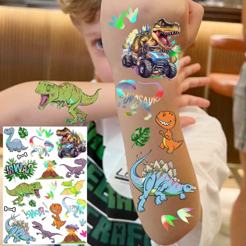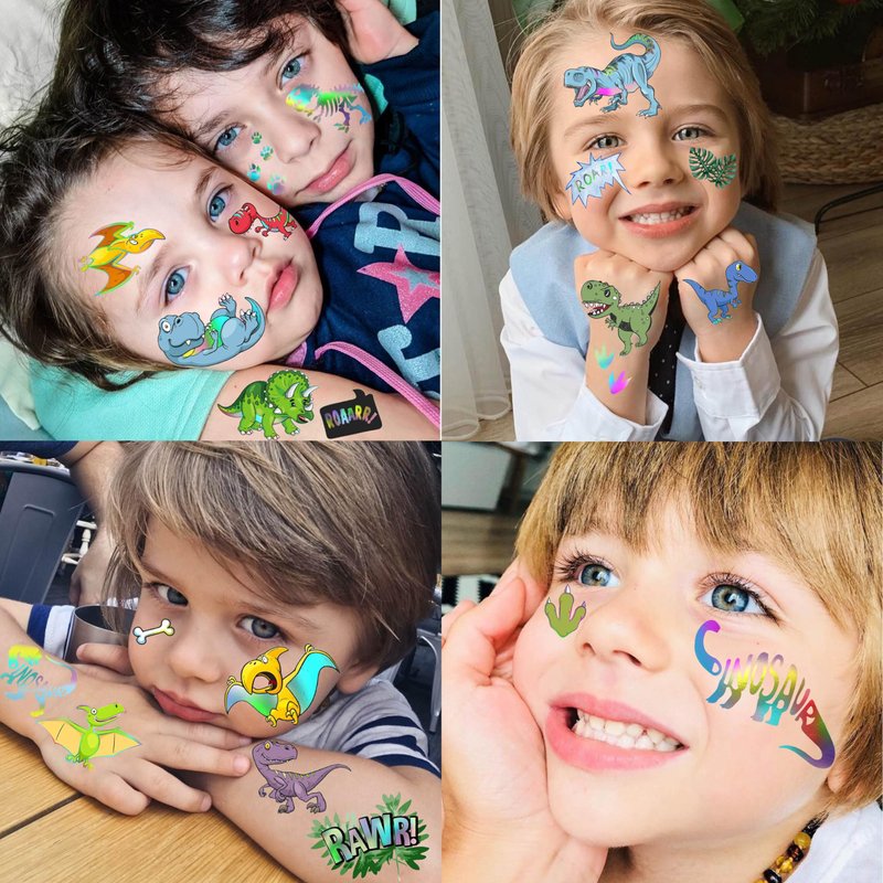 - 🌟4 Sheets 91+ Patterns Cute Cartoon Glitter Iridescent Metallic Dinosaur Temporary Tattoos For Kids Boys Girls Teens Variety Designs -- JOEHAPY Brand Small Dinosaur Tattoos For Kids. One Package Includes 4 Sheets Tyrannosaurus, Prehistoric Roar T-Rex, Pterosauria, Volcono, Dino, Eggs, Stegosaurus, Pterosaurs, Triceratops, Brontosaurus, Rainforest, Leaf Temporary Tatoos Paper.