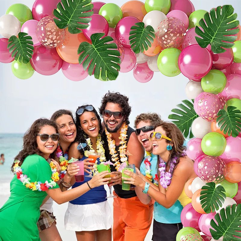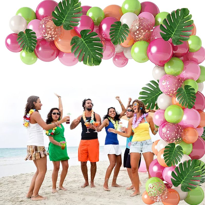 - 【Easy to Use】: Simply inflate the colorful balloons then strip with balloon knot tool to balloon strip, after finish, you can hang the balloons on the wall or windows or use with balloon arch stand according to your request, the tropical leave you can stick to the balloons or put on table for table decorations. These tropical balloons garland arch also can be work as photo booth prop party backdrop. Enjoy your parties.
