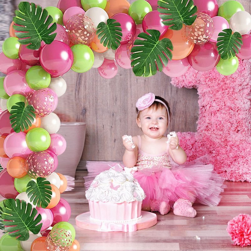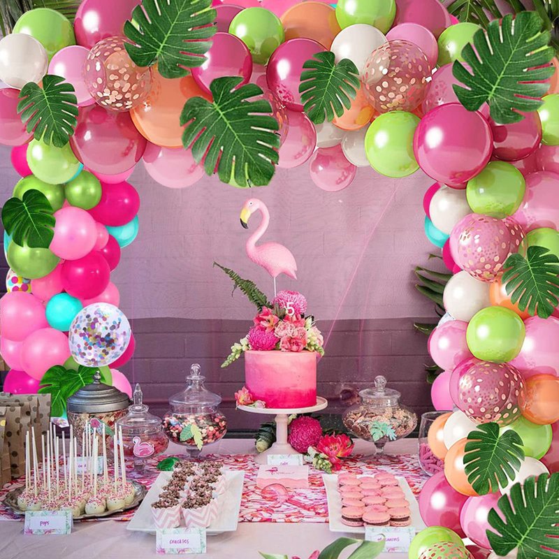 - 【Tropical Theme Balloon Garland Arch Kit】: Hawaii theme balloons garland comes with 10Pcs 12" champagne balloons, 10Pcs 12" green balloons, 10Pcs 12" pink balloons, 10pcs 12’’ rose gold confetti balloons, 10Pcs 10" pink balloons, 10Pcs 10" rose red balloons, 5Pcs 5" champagne balloons, 5Pcs 5" green balloons, 5Pcs 5" white balloons, 6pcs 6’’ palm leaves, 6pcs 8’’ palm leaves, 1pc balloon knot toll, 1pc 5m balloon strip, 1 roll glue dot, 1pc balloon ribbon, totally 91pcs.