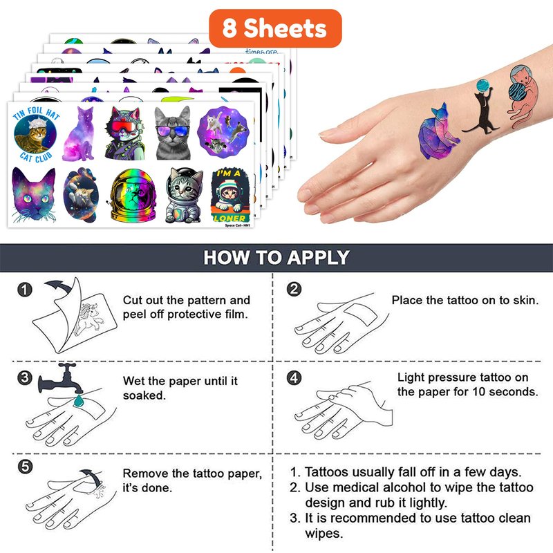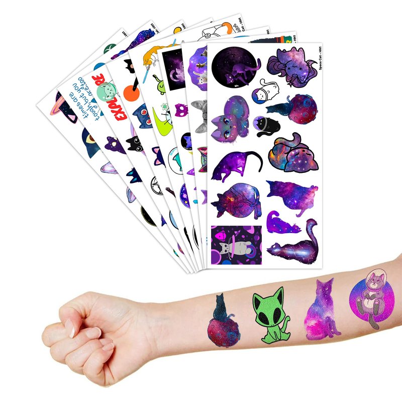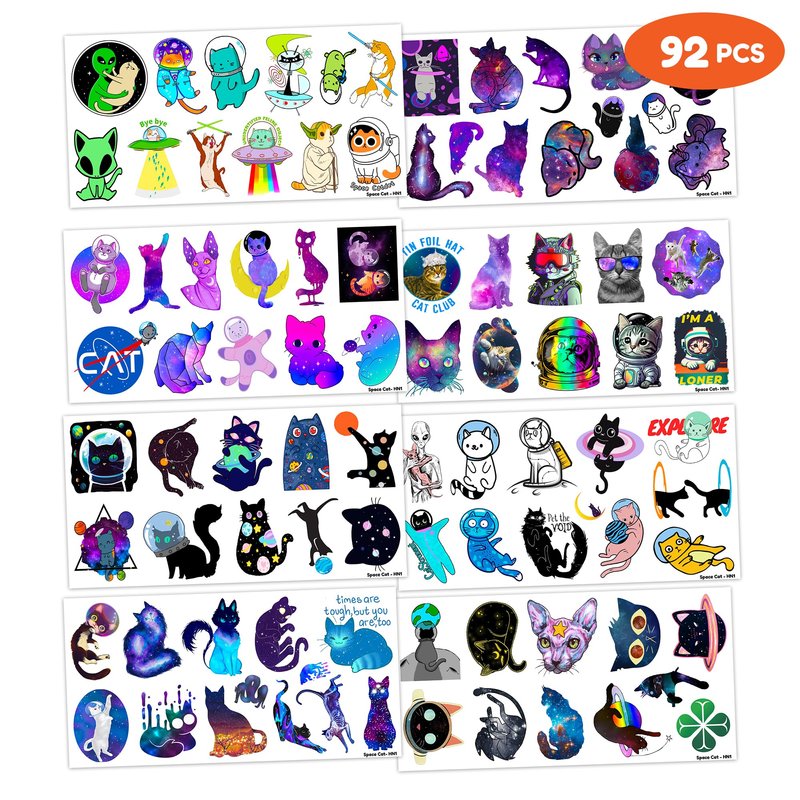 - Pattern rich: Funny Space Cat Cute Galaxy Cats Astronaut Star Temporary Tattoos for Kids include 8 Sheets 92 PCS, the size of each sheet is 6.1 * 3.1 inches. Having a variety of characteristics, shapes and vibrant colors can stimulate your children's imaginations and bring a creative atmosphere to your Space Cat Party.