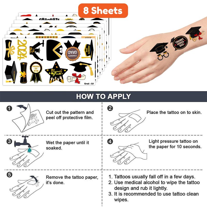 - Perfect Happy Graduation Congrats Grad Birthday Decorations: All the temporary tattoos are design with many themed. Fits any smooth part: face, hands, arms, shoulders, back, legs water bottle, cup,mug and other stuff and so on. Great fun for party favors, birthday gift, clubs, festivals or party supplies,etc. and can be used by children, kids, girls, boys, women, men.