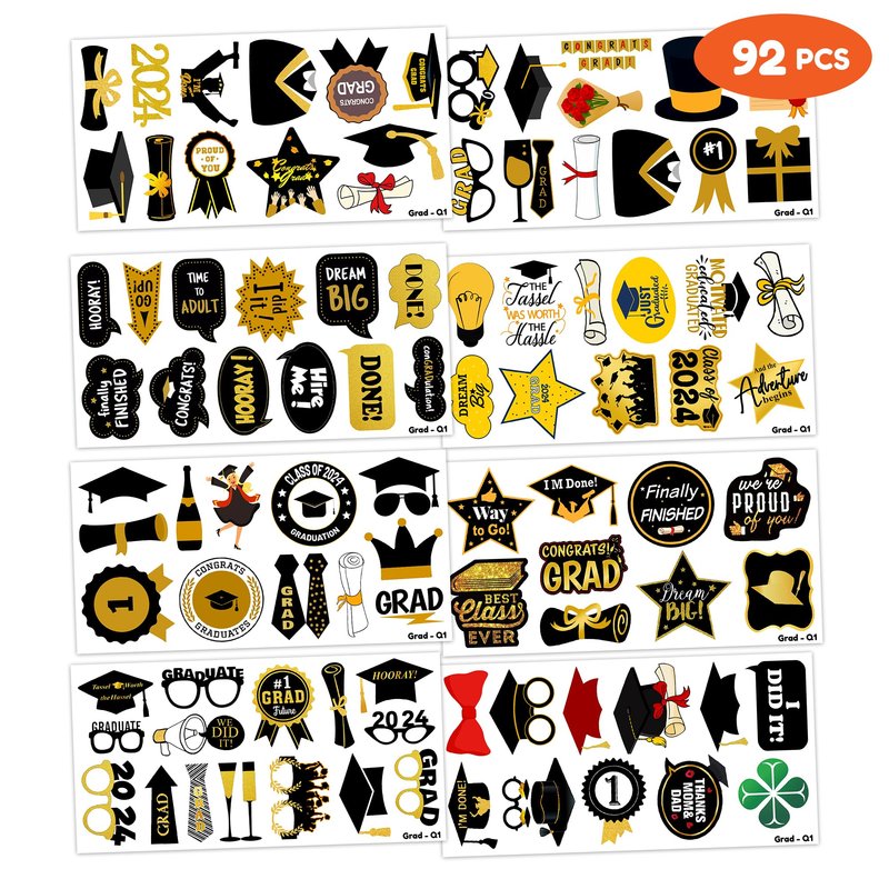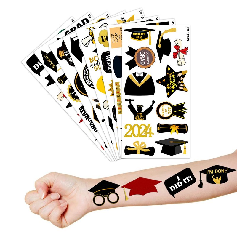 - Cute Happy Graduation Congrats Grad Party Supplies: 8 sheets Happy Graduation Class Graduates High School College theme temporary tattoos stickers, features an assortment of cute themed characters, each pattern measures 6.1 x 3.1 inch , all kinds of designs and colors will bring more fun to your party, one size fit all adult and kids.