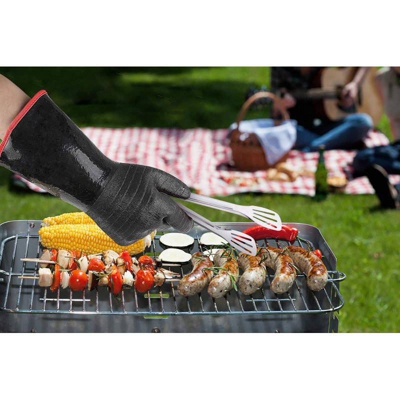 - SAY GOODBYE TO BURNS! At 14” inches long, our BBQ gloves better protect fingers, hands and wrists from burns. And Our cooking gloves are heat resistant up to 932°F / 500°C durable.use this bbq accessories for your turkey fryer ,campfire,fireplace,charcoal,pit & barbecue gas grills as well