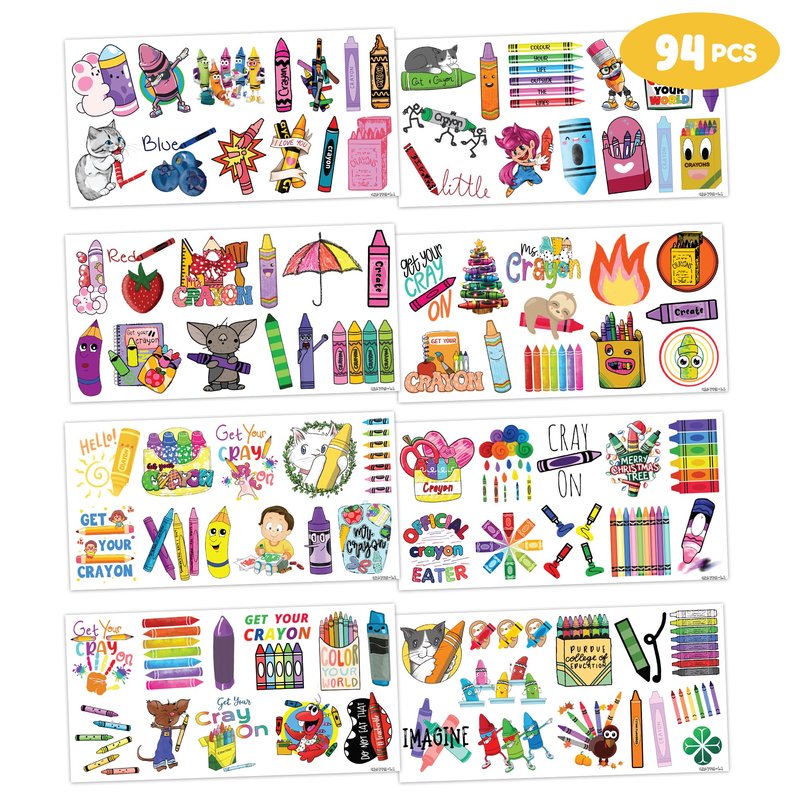 - 🖍️ PERFECT TATTOOS FOR CRAYON THEMED DECORATION: Crayon tattoos for people who love crayon, painting. Featuring 8 sheets with 94 pcs of lovely, fun and colorful design. Each sheet measures 6.1 * 3.1 inches. You can temporarily tattoo them on your body or objects such as phones, bottles, laptop…