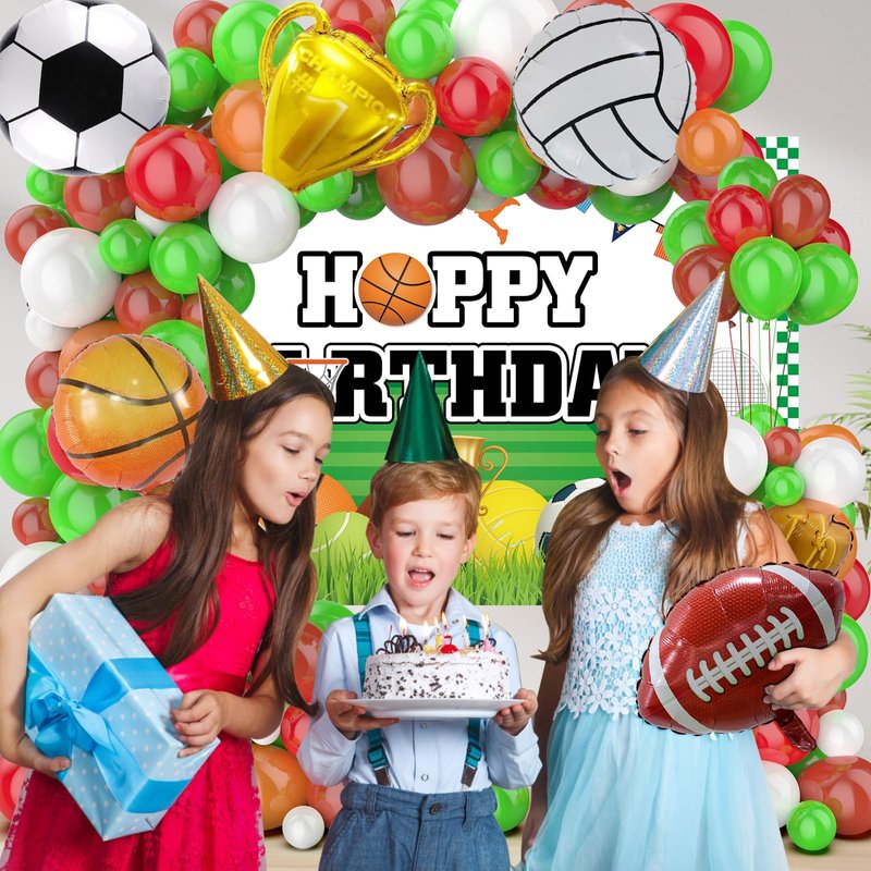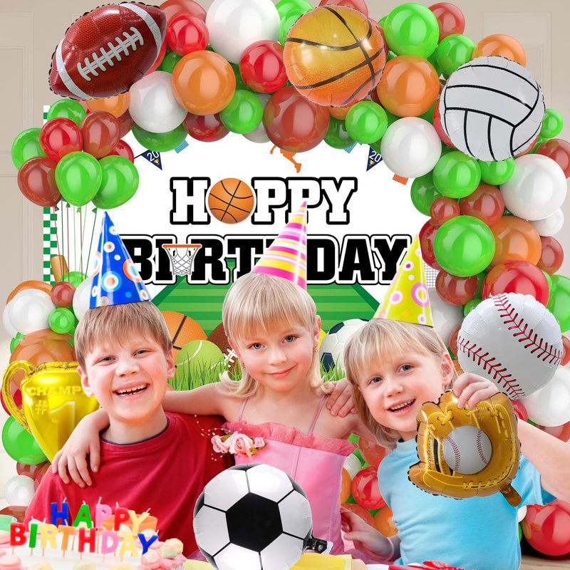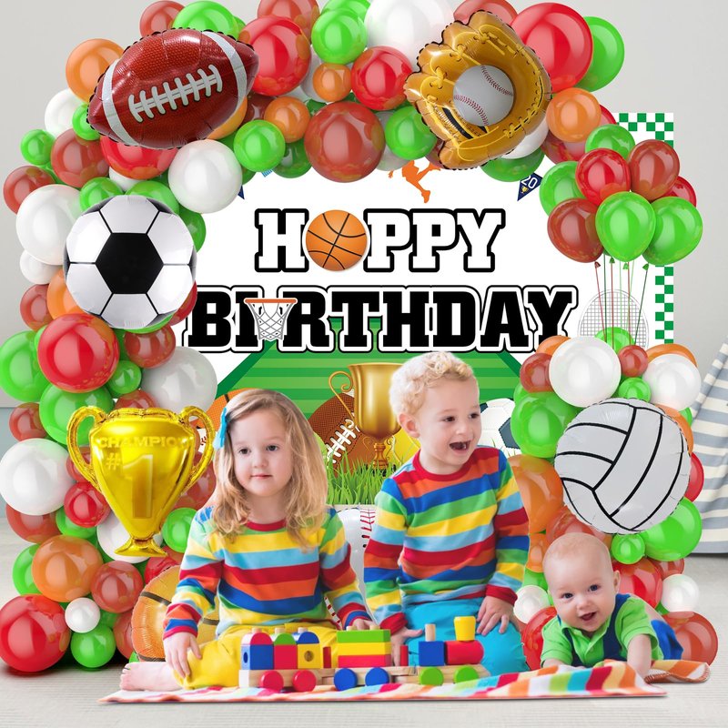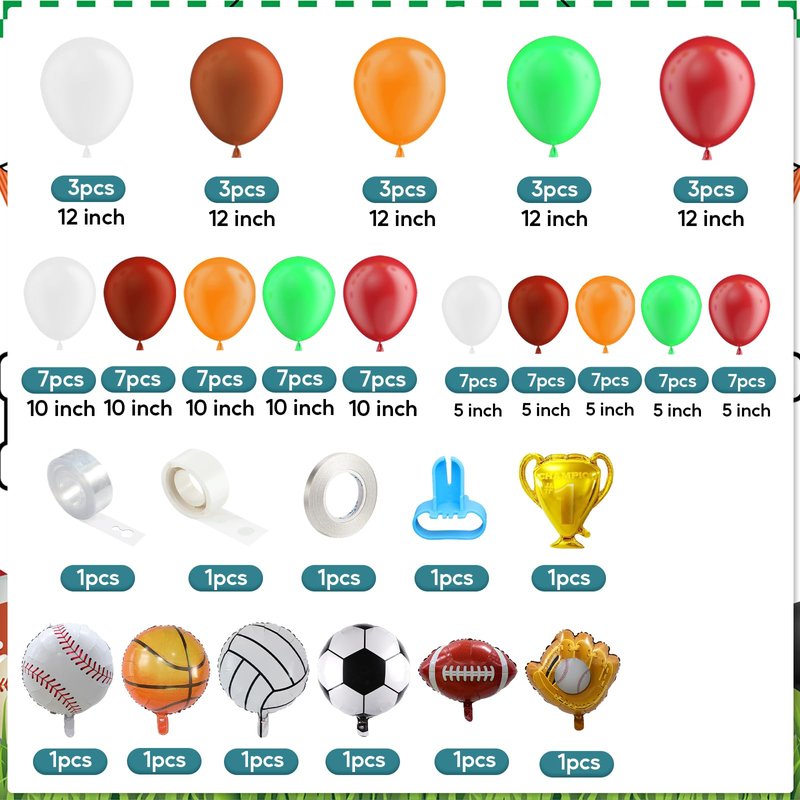 - 【Sports Party Decorations】 The sports balloon arch kit includes 85 PCS solid color latex balloons (5 inch x 35,10 inch x 35, 12 inch x 15),1 pcs volleyball balloon,1 pcs baseball balloon,1 pcs baseball glove balloon, 1 pcs football balloon,1 pcs basketball balloon, 1 pcs soccer balloon,1 PCS sports games theme birthday backdrop,1 pcs balloon strip and 100 pcs dot glue, 1 pcs ribbon, 1 pcs balloon tie tool