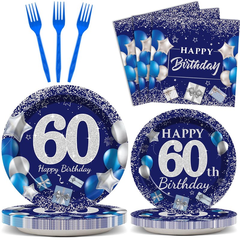 24 pieces 60th birthday plates of 9inch, 24 pieces plates of 7inch, 24 pieces navy blue and silver birthday party napkins of 6.5inch and 24 plastic blue forks for each set that can serve 24 guests.