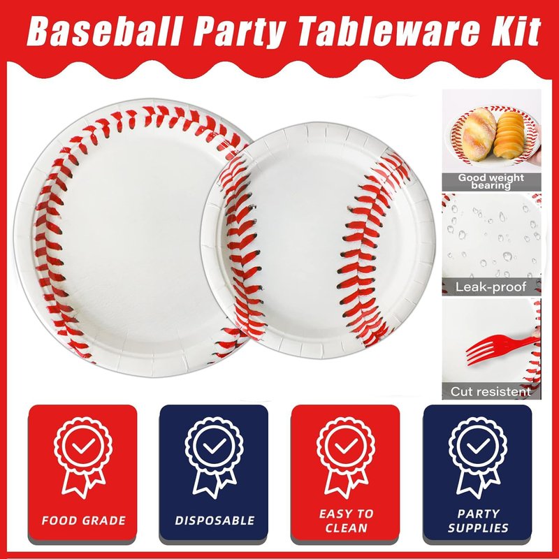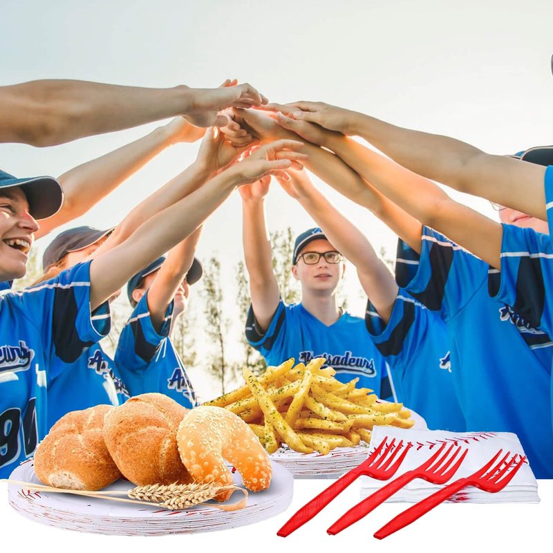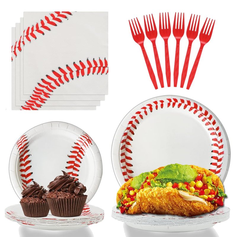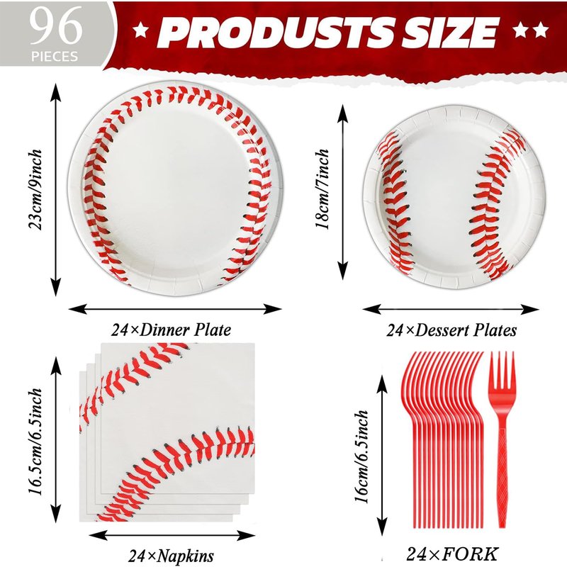 - Baseball Party Decorations Plates set, includes: 24 plates (9inch) + 24 plates (7inch) + 24 napkins (13inch) + 24 forks, There are a total of 96 pieces in this set, which will add fun to any Baseball Party, Baseball birthday party.