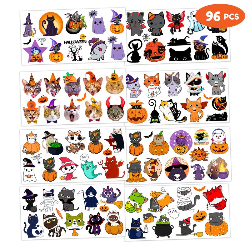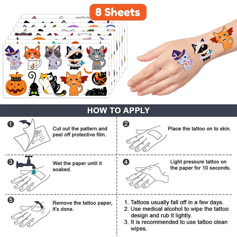 - 【The Perfect Black Cat Halloween Magic Cats Pet Theme Party Gift】8 Sheets Black Cat tattoos stickers, each pattern measures 6.1 * 3.1 inch , one size fit all adult and kids. One of the most popular party themes for children, make the best party gifts for your children & Carnival gifts, help your children become small heroes at the party! Bring nonstop joy to the whole party! Make your kids receive full of expectation and exploration in every festival.