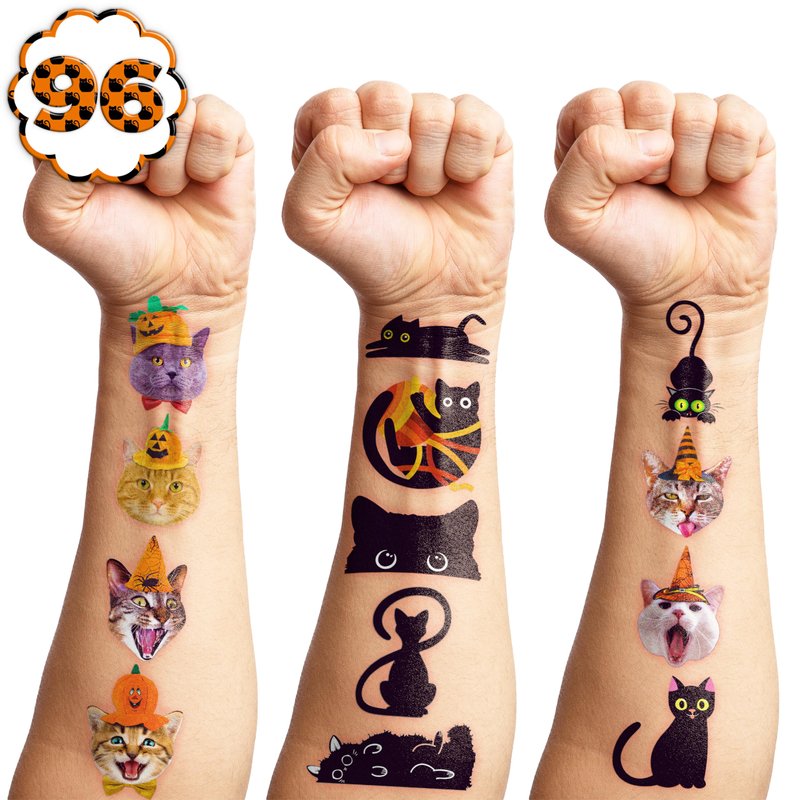 96 PCS Black Cat Temporary Tattoos Theme Birthday Party Supplies Decorations Favors Decor Cute Halloween Magic Cats Pet Tattoo Stickers Gifts for Games Kids Girls Boys Classroom School Prizes Carnival