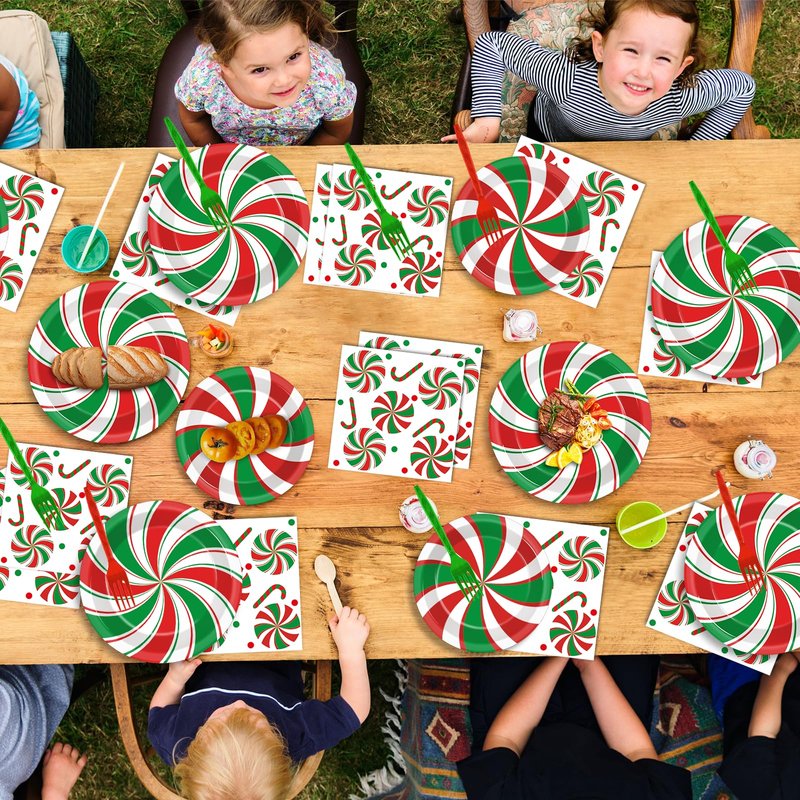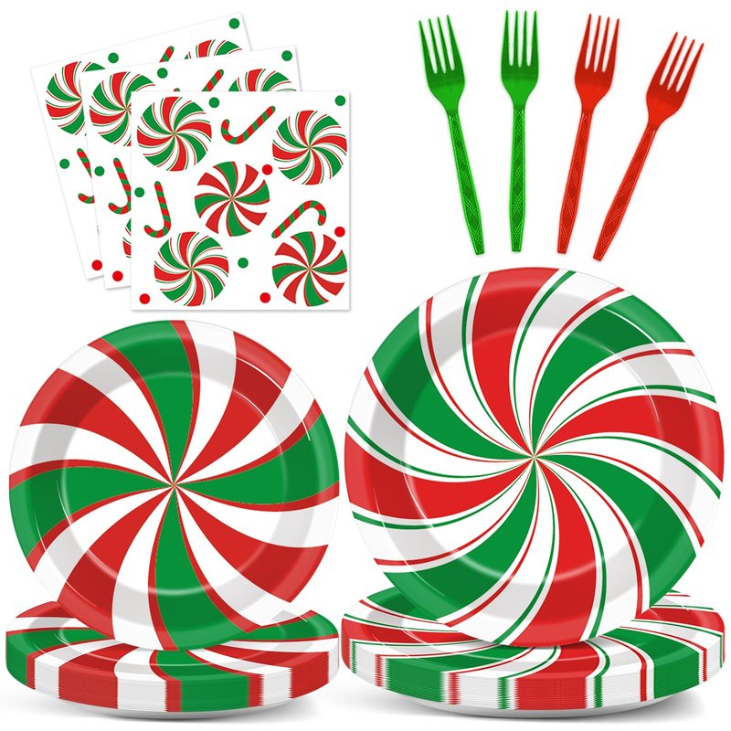 - Christmas peppermint party supplies: Includes 24 * 9inch Christmas paper dinner plates, 24 * 7inch plates, 24 * 6.5inch Christmas napkins, 12 red plastic forks and 12 green plastic forks, which will add fun to Christmas theme party. Can be applied for Christmas dessert plates or Christmas peppermint decorations, all in quantities perfect for serving 24 guests. The peppermint-themed design adds a special touch to your party and makes for a great Christmas party favor.