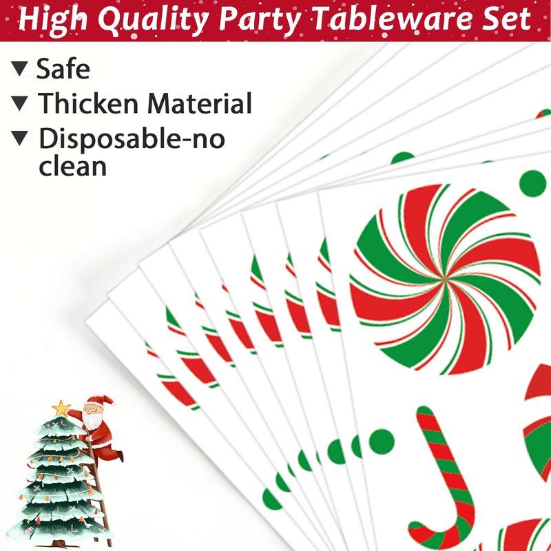 - Premium material: Our Christmas party supplies are made from high-quality paper, ensuring they are odorless, heat-resistant, and durable. The well-printed Red and White Peppermint colors are fade-resistant, guaranteeing a party full of merry Christmas atmosphere. The Christmas party tableware sets are perfect for serving up your favorite dishes. Don't settle for anything less than the best - elevate your Christmas celebration with our premium quality Christmas party tableware.