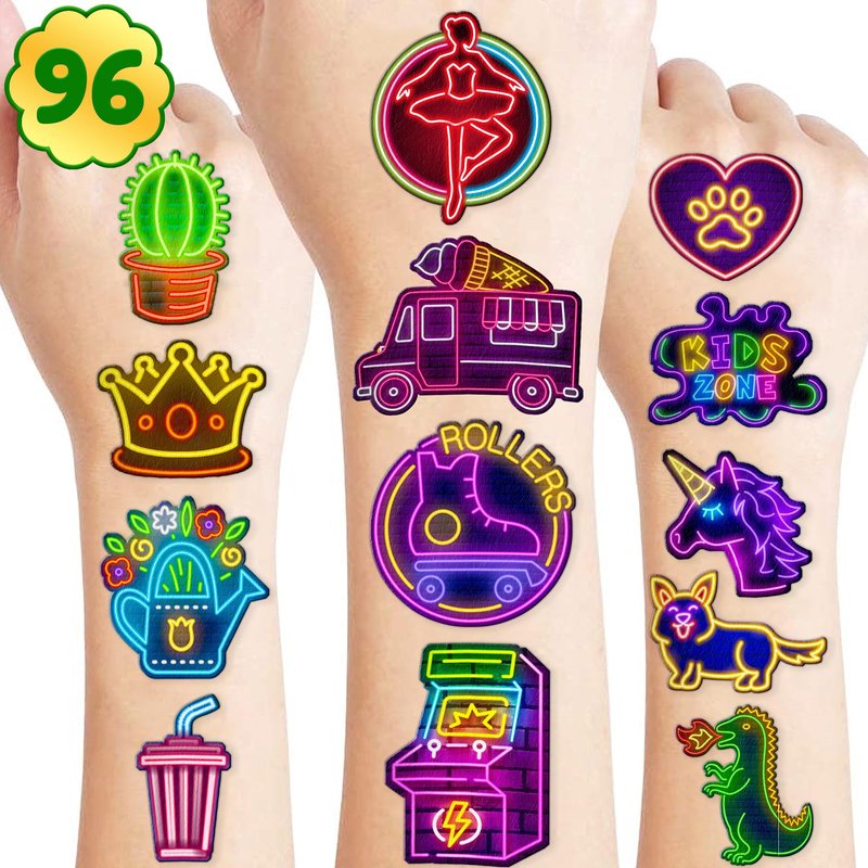 96 PCS Cool Glow Neon Light Temporary Tattoos Themed Birthday Party Favors Decorations Supplies Cute BlackLight Tattoo Stickers Gifts For Kids Boys Girls Prizes Carnival Christmas Holiday Halloween