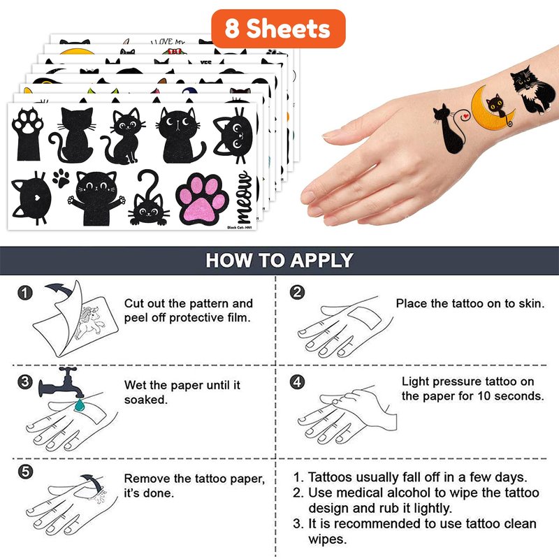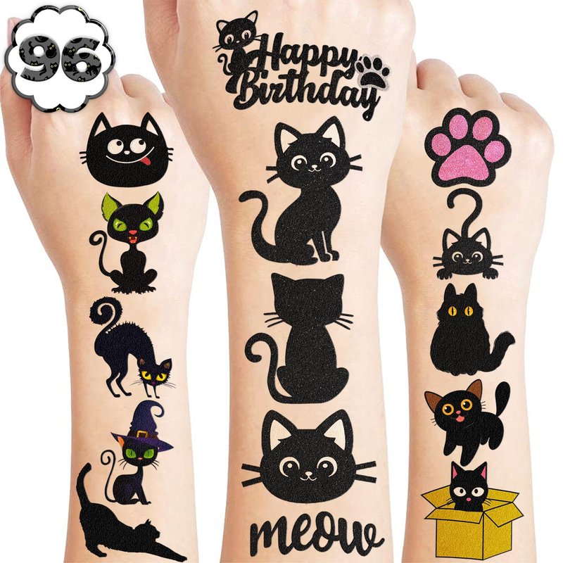 - Pattern rich: Cute Black Cat Funny Kitten Pet Meow Temporary Tattoos for Kids include 8 Sheets 96 PCS, the size of each sheet is 6.1 * 3.1 inches. Having a variety of characteristics, shapes and vibrant colors can stimulate your children's imaginations and bring a creative atmosphere to your Black Cat Party.