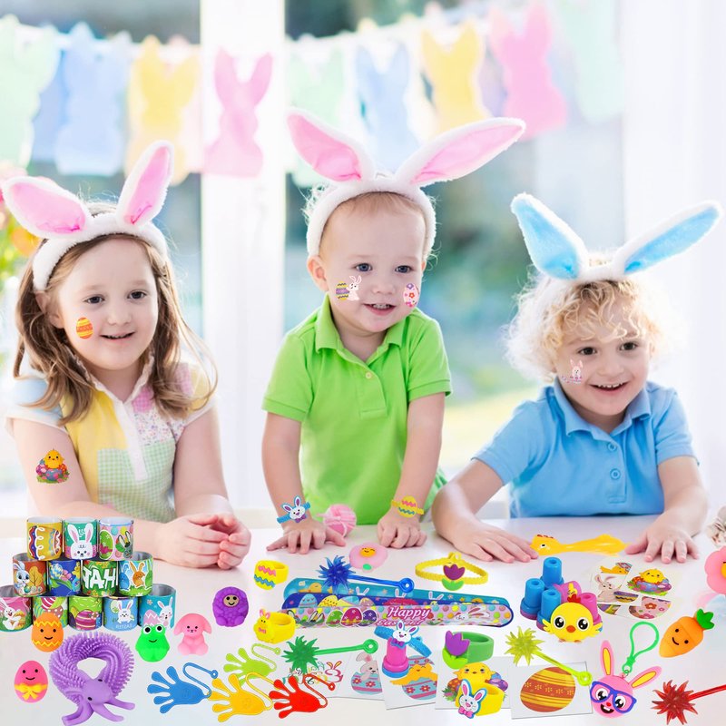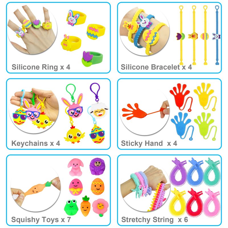 - 【Safety Materials】 This bulk Easter toy set is made of rubber and high quality plastic, safe Easter egg fillers for kids toddlers teens boys girls. The Easter squishy touch soft , fidget toys are stress relieve while the tattoos are fun for decorating. A versatile set offers endless fun for Kids Easter