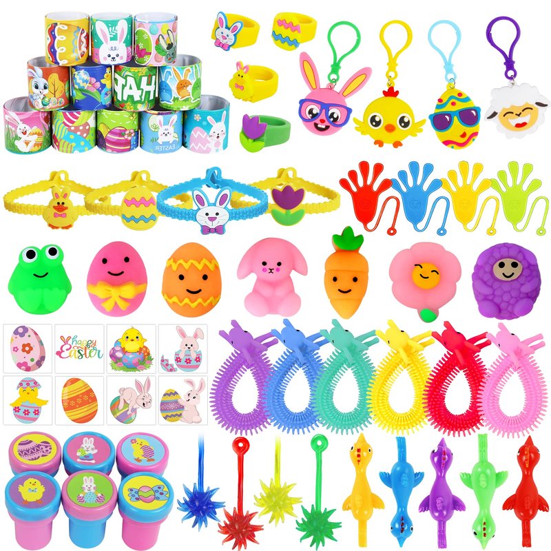 - 【Easter Basket Stuffers】Package comes with 96 assorted Easter toys. 7 mochi squishies, 6 stretchy strings, 6 Easter stampers, 12 slap bracelets, 5 slingshot chickens, 4 stress relive ball toys, 4 sticky hands, 4 silicone rings, 4 silicone bracelets, 4 keychains and 40 Easter tattoos