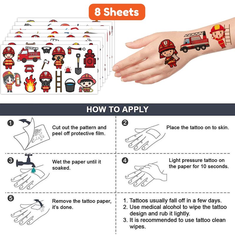 - π§βπ PERFECT TATTOOS FOR FIREFIGHTER-THEMED DECORATION : Firefighter tattoos for people who love Firefighter, Fire Truck. Featuring 8 sheets with 90 pcs of lovely, fun and colorful design. Each sheet measures 6.1 * 3.1 inches. You can temporarily tattoo them on your body or objects such as phones, bottles, laptopβ¦