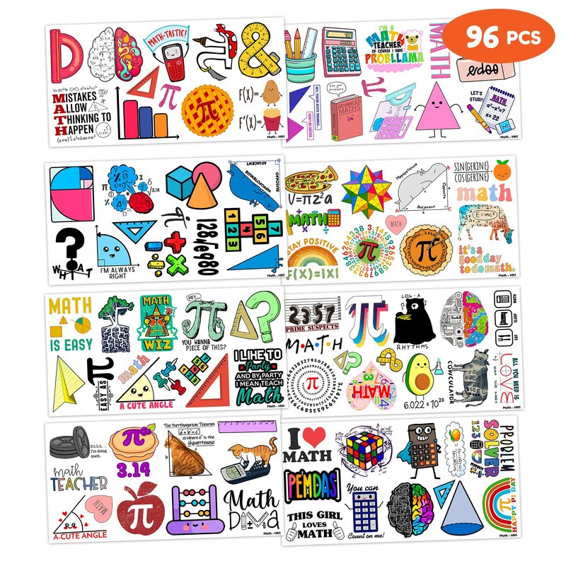 - Funny Cute Math Formula Symbols Mathematics Birthday Party Supplies: 8 Sheets 96 PCS Cute Math Formula Symbols Mathematics temporary tattoos stickers, Have a variety of cartoon themed characters, Children can easily Cute Math Formula Symbols Mathematics stickers and take unique photos to make fond memories. The size of each sheet is 6.1 * 3.1 inches.