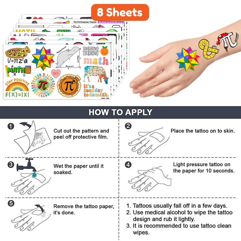 - Funny Cute Math Formula Symbols Mathematics Birthday Party Decoration: The set contains instructions for use and is easy to use. Fast food tattoo stickers can be applied on arms, face, hands, neck, shoulders, legs, wrists and ankles to make you look cool at all kinds of parties. Popular hit with your kids. You can apply them to your body or some smooth objects, for example, glass, stationery, paper, crafts cups, cabinet, bottle.