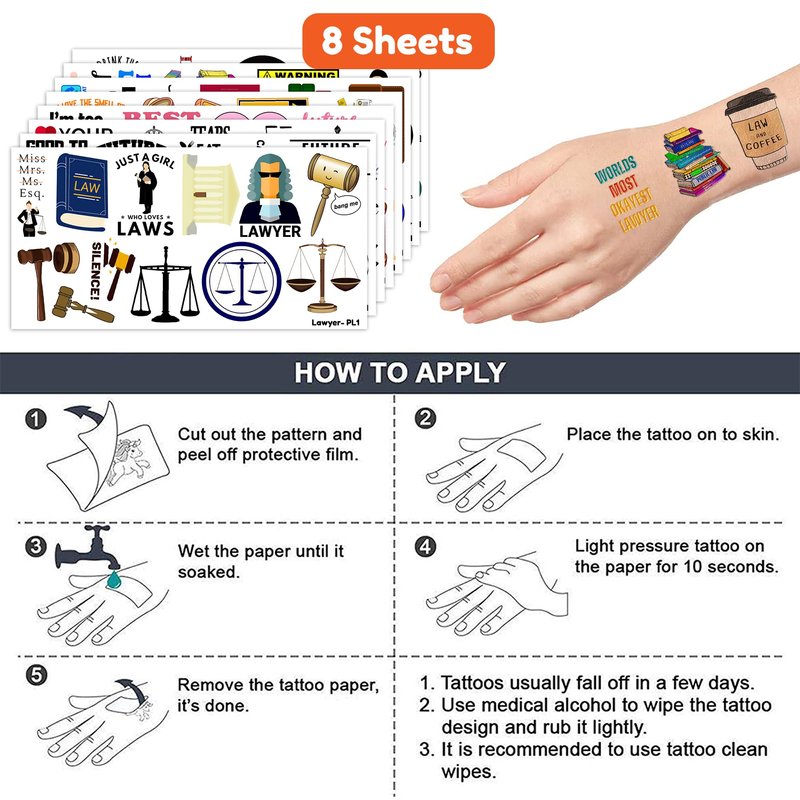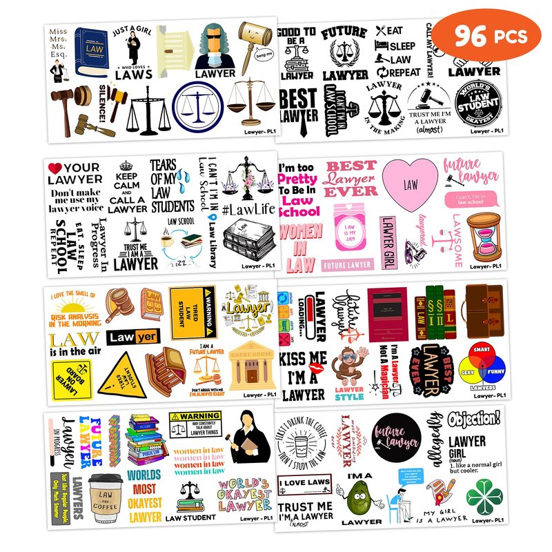 - Cute Future Best Lawyer Law School Justice Party Supplies: 8 sheets Future Best Lawyer Law School Justice theme temporary tattoos stickers, features an assortment of cute themed characters, each sheet measures 6.1 x 3.1 inch , all kinds of designs and colors will bring more fun to your party, one size fit all adult and kids.