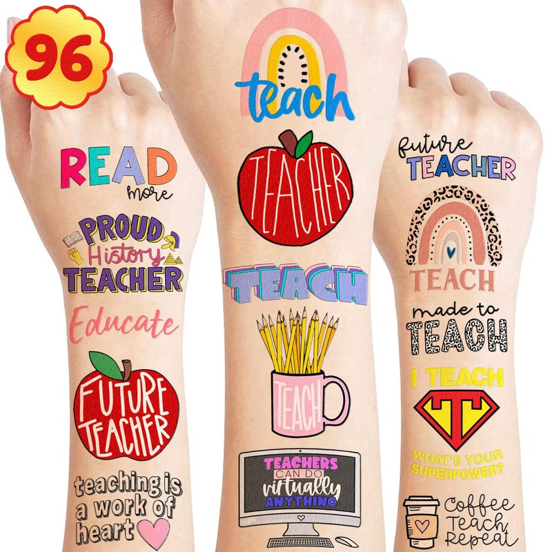 96 PCS Future Teacher Day Temporary Tattoos Stickers Themed Birthday Party Decorations Supplies Favors Decor Cute Quote Tattoo Sticker Gifts for Teachers Kids Girls Boys School Rewards Prizes Carnival