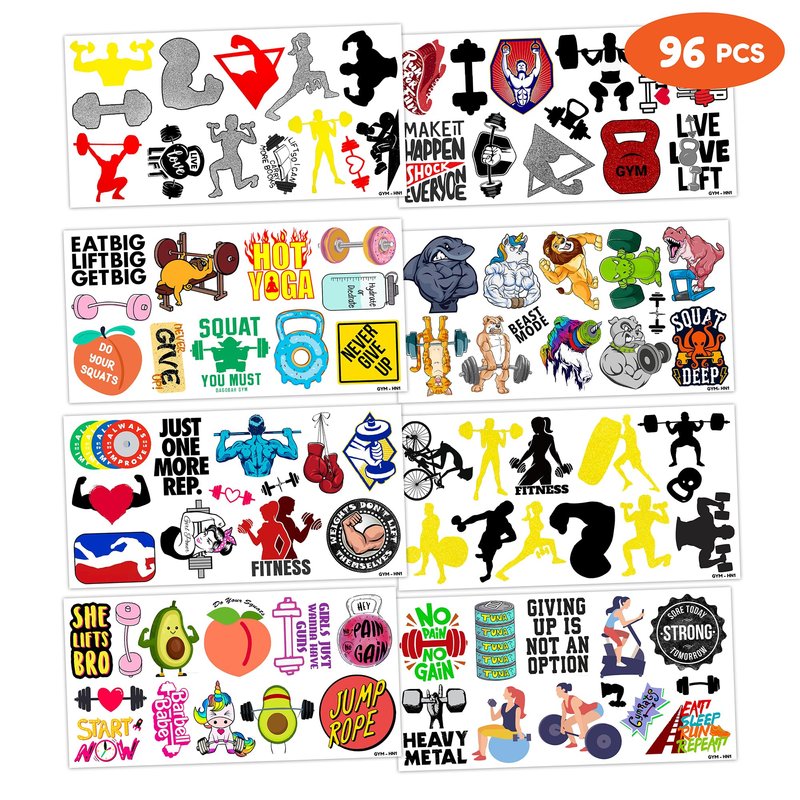 - Pattern rich: Gym Temporary Tattoos for Planner include 8 Sheets 96 PCS, the size of each sheet is 6.1 * 3.1 inches. Having a variety of characteristics, shapes and vibrant colors can stimulate your children's imaginations and bring a creative atmosphere to your Gym Fitness Workout Theme Party.