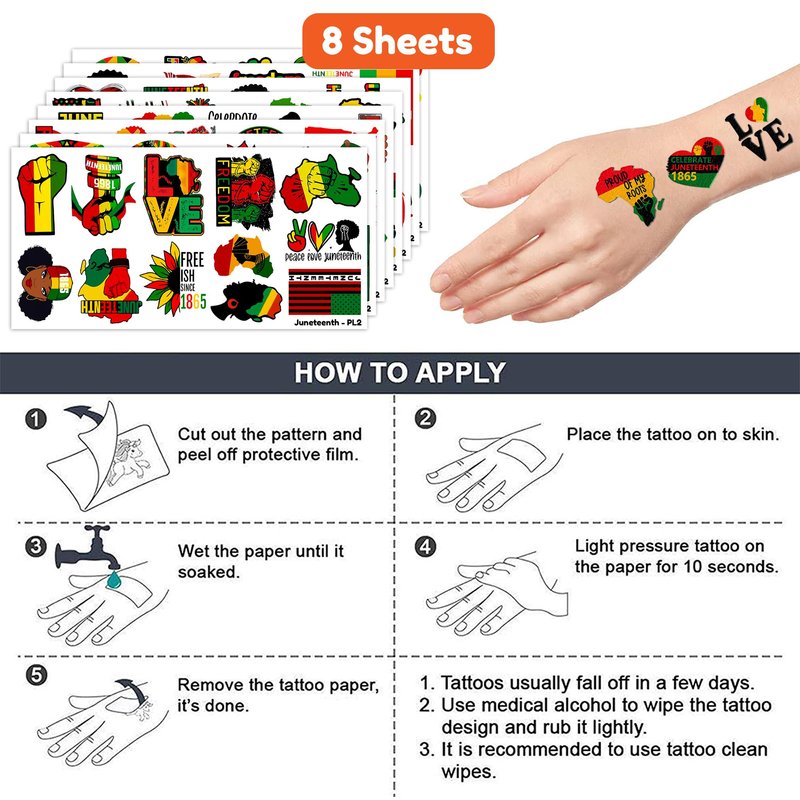 - Fun Happy Juneteenth Freedom Day Birthday Party Decoration: The set contains instructions for use and is easy to use. African Americans Independence tattoo stickers can be applied on arms, face, hands, neck, shoulders, legs, wrists and ankles to make you look cool at all kinds of parties. Popular hit with your kids. You can apply them to your body or some smooth objects, for example, glass, stationery, paper, crafts cups, cabinet, bottle.