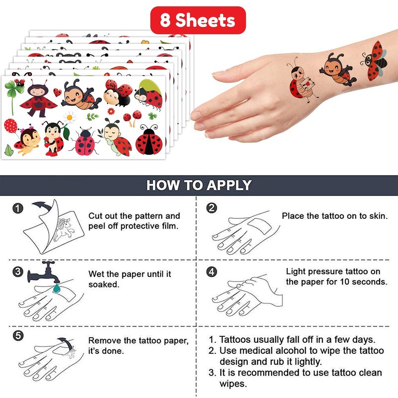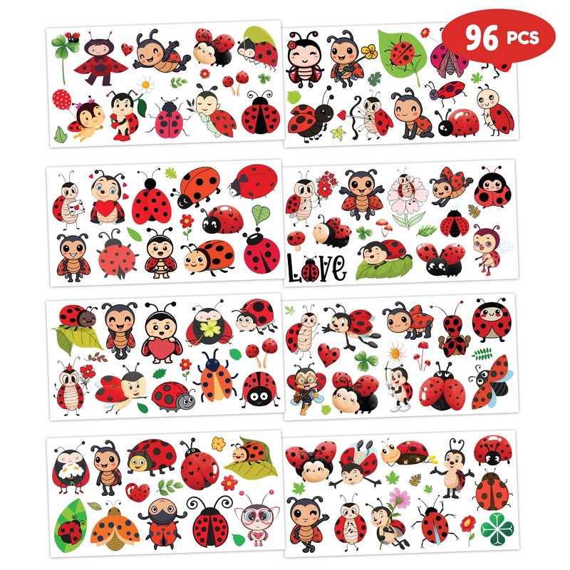 - π PERFECT TATTOOS FOR LADYBUG THEMED DECORATION: LADYBUG TATTOOS for people who love bug, beetle, ladybug. Featuring 8 sheets with 96 pcs of lovely, fun and colorful design. Each sheet measures 6.1 * 3.1 inches. You can temporarily tattoo them on your body or objects such as phones, bottles, laptopβ¦