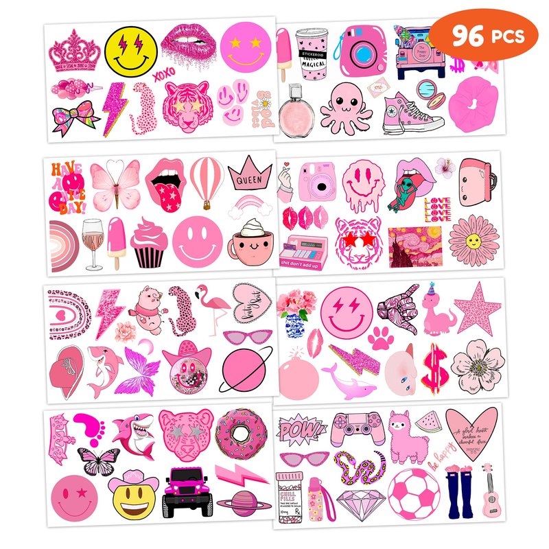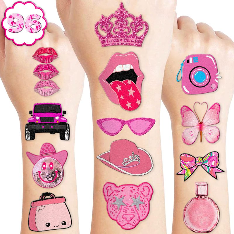 96 PCS Pink Preppy Bachelorette Princess Temporary Tattoos Theme Birthday Party Decorations Supplies Favors Decor Cute Girl Pastel Face Tattoo Stickers Gifts for Kids Girls Boys School Prizes Carnival