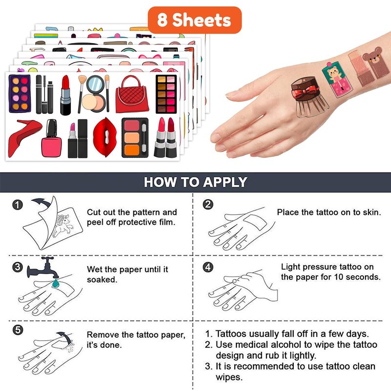Pattern rich: Spa Makeup Beauty Cosmetic Nail Temporary Tattoo for Kids include 8 Sheets 96 PCS, the size of each sheet is 6.1 * 3.1 inches. Having a variety of characteristics, shapes and vibrant colors can stimulate your children's imaginations and bring a creative atmosphere to your Spa Makeup Beauty Cosmetic Nail Theme Party. Widely used: These cute Spa Makeup Beauty Cosmetic Nail Temporary Tattoo pieces are suitable for many occasions such as birthday parties, birthday gifts, party decorations, gatherings and other special celebrations. It also can be applied on laptop, cup, luggage, phone case and so on which could make you look more impressive. How to use: It’s very simple and easy to use. Cut your favorite tattoo from the sheet and stick it on your hands, arms, face or wherever you like. Simply removed by baby oil or alcohol to wipe it back and forth. Safety Material: Our products mainly use environmental protection ink, waterproof and environmentally friendly glue which is reliable and friendly to your skin. Note: Not recommended for people with a history of sensitive skin, if symptoms appear, stop using immediately.