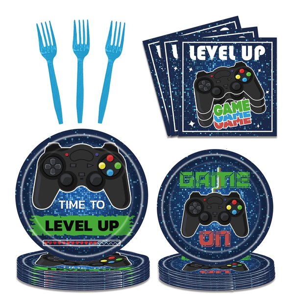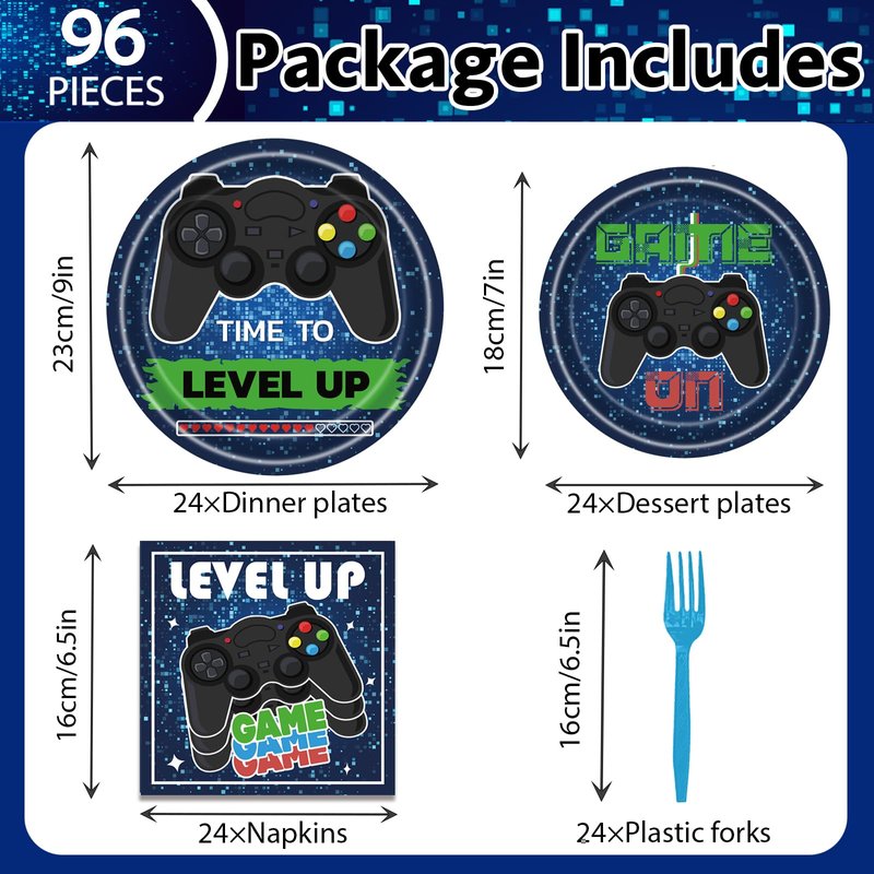 - What You Will Get: You'll receive 24 plates (9inch) + 24 plates (7inch) + 24 napkins (6.5inch) + 24 forks, there are a total of 96 pieces in this set, which will add fun to your video game party.